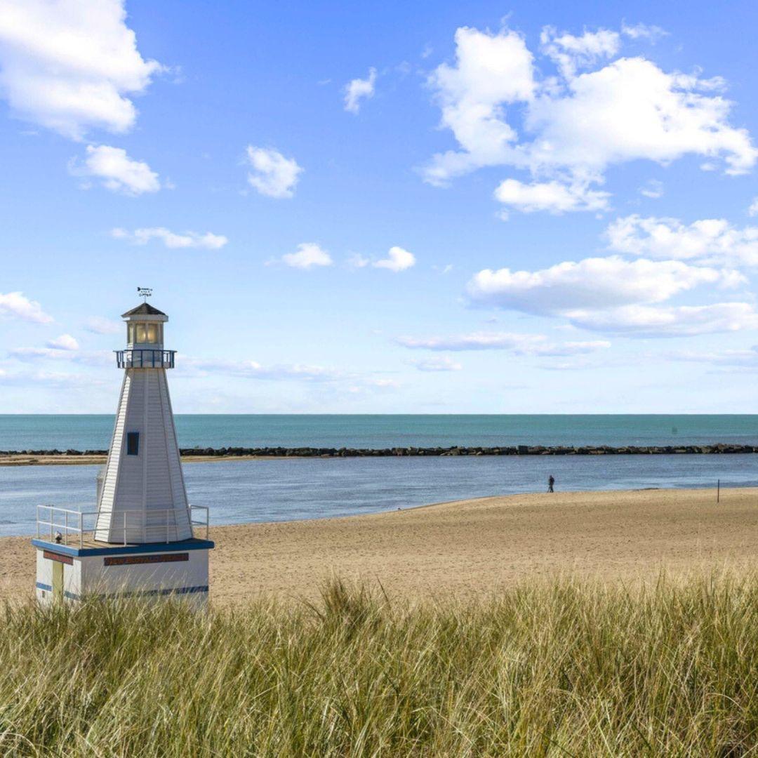 - Shoreline:Large beach area with plenty of space to spread out, playground and bathrooms available. Stay off and away from the break wall.