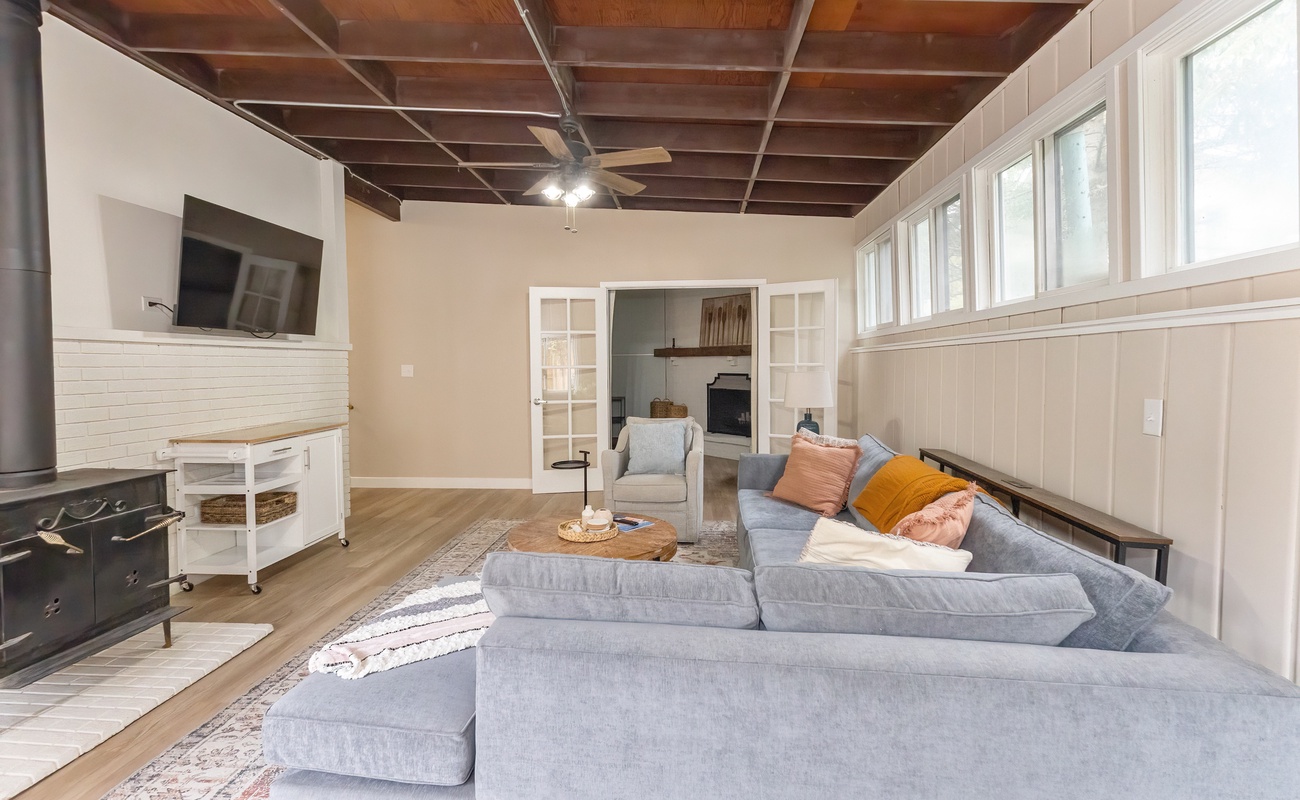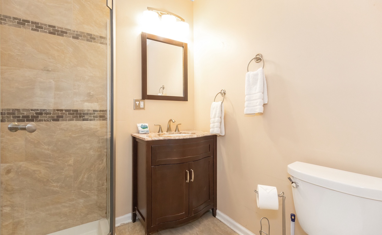 The lower level adds a relaxed lounge space with a sleeper sofa, TV, and walk out access to the backyard, creating a perfect hangout for kids, teens, or additional guests. Outside, the fenced yard offers room to spread out, enjoy the fire pit, and dine outdoors on the patio with the gas grill. Kayaks, beach chairs, a wagon, toys, and more are provided to make lake days effortless, giving you everything needed for a laid back Harbor Country getaway.