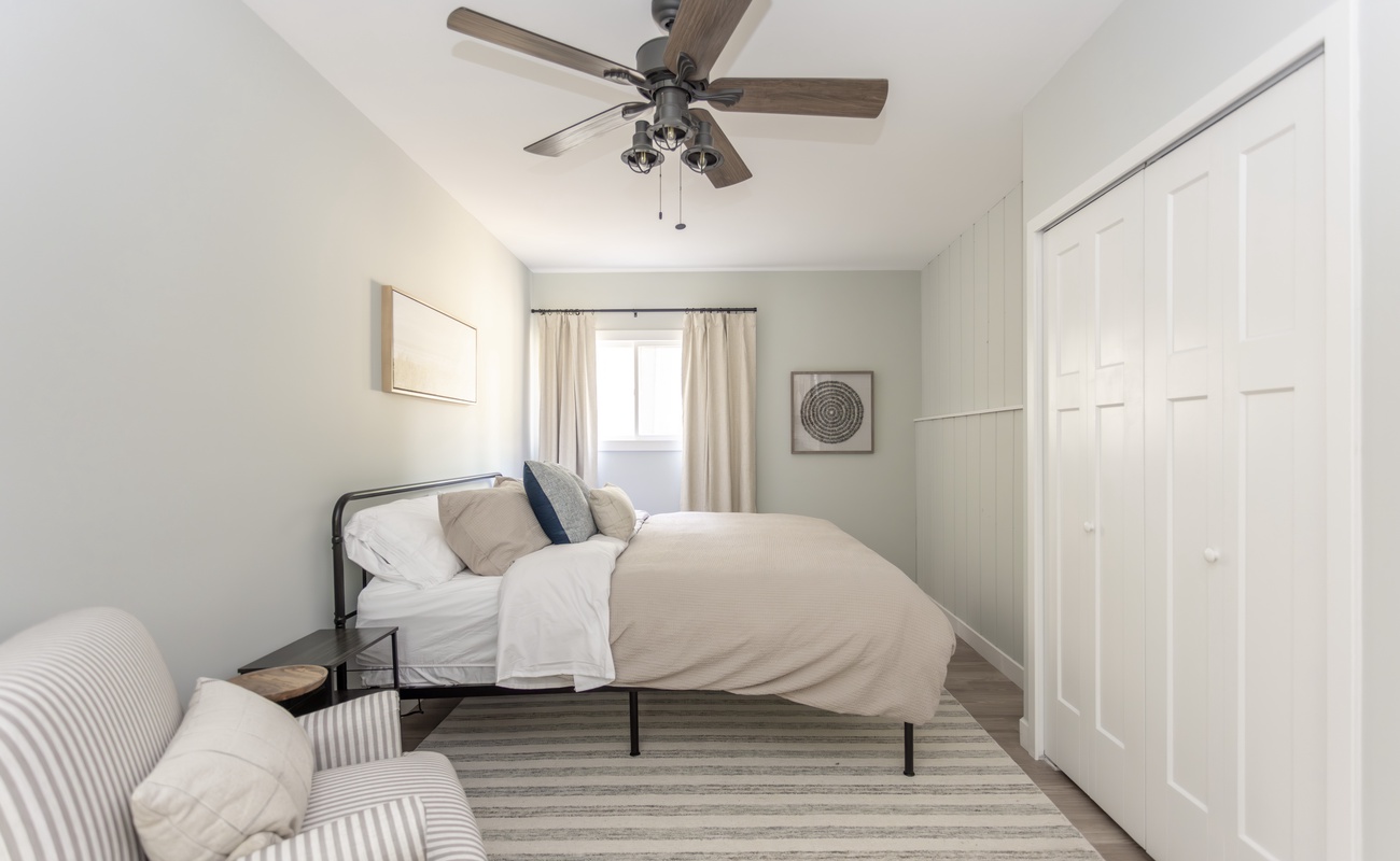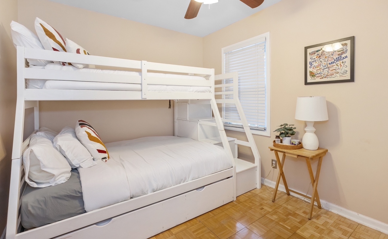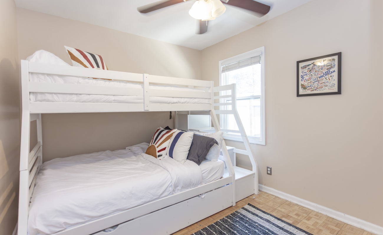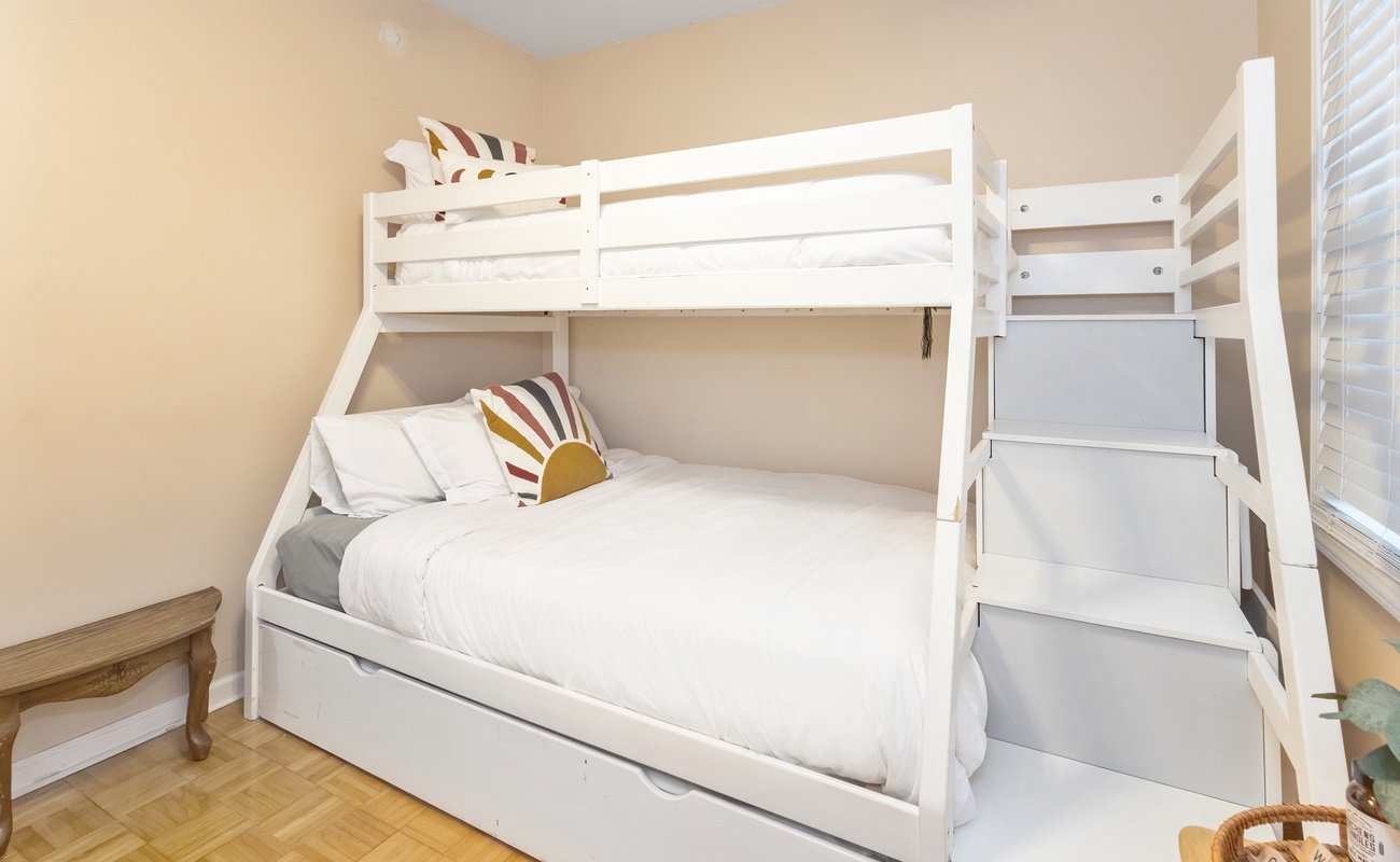 Bunk bed with full bed on the bottom, twin on the top. Can sleep up to 3