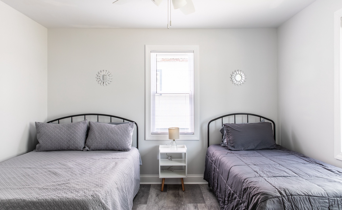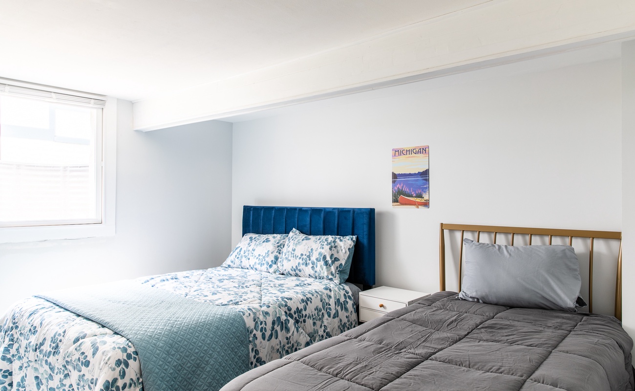 Basement bedroom with double and full beds with spacious closet.