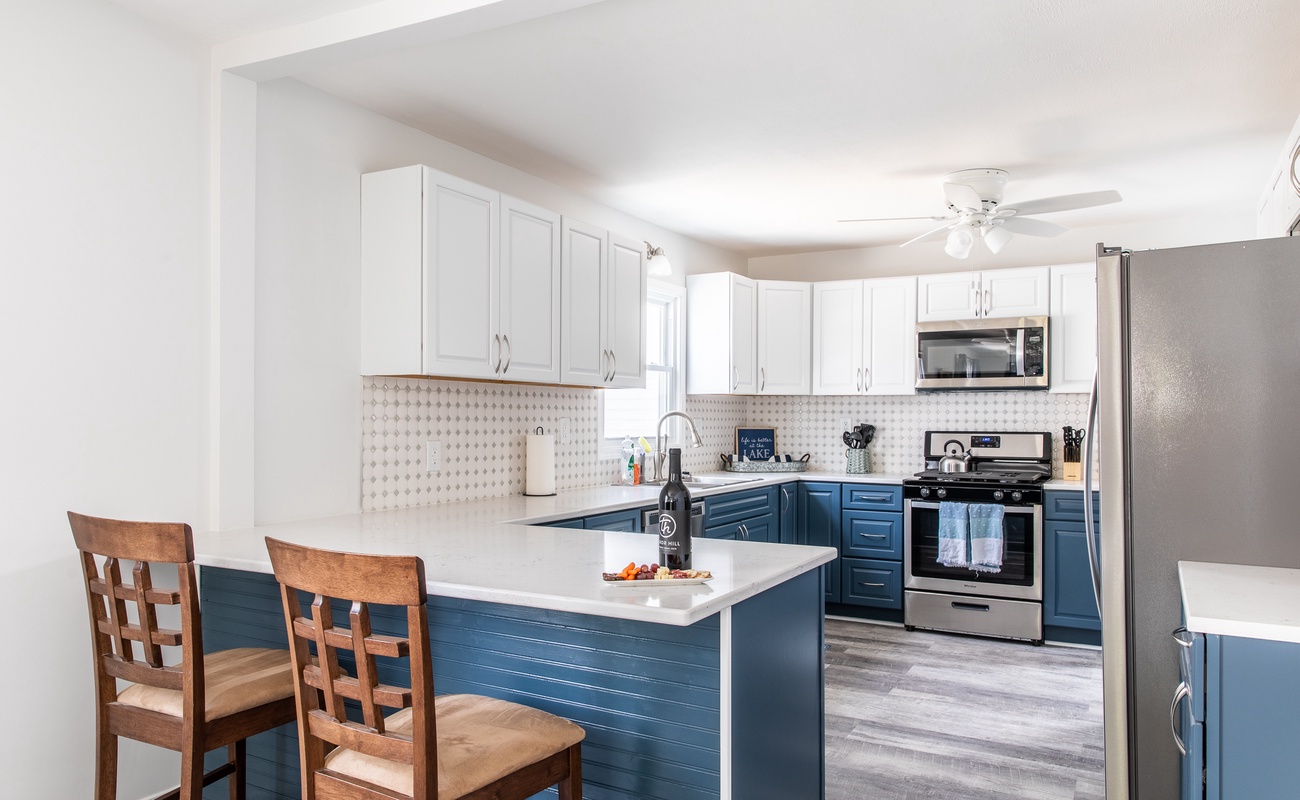 When you enter the home you’ll step into a large, open floor plan with lots of natural light. The living flows into the dining room which connects to the kitchen over a bar with seating for 2. Off to the right of the main living area are 2 bedrooms. The Master bedroom has a Queen bed and en suite bathroom and offers access to the back deck through a sliding door.