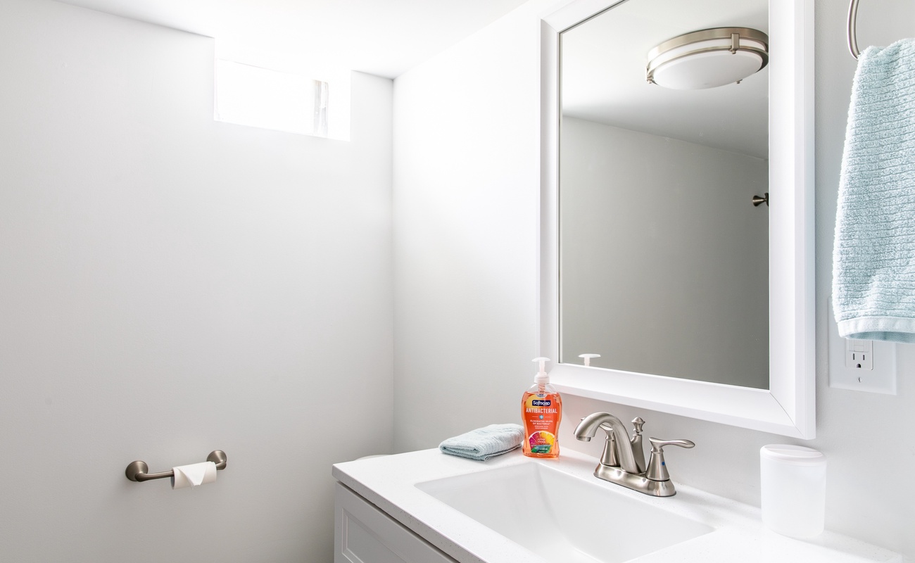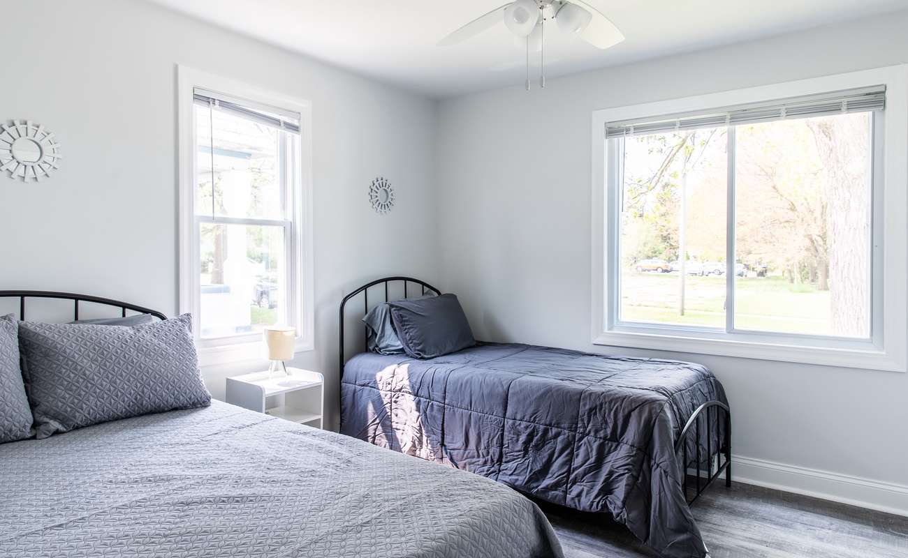 Head downstairs to a second living room with a TV and cozy seating. Off this secondary living space are two more bedrooms and a bathroom. The back basement bedroom has a full bed and a twin bed and the front basement bedroom features a Queen bed.