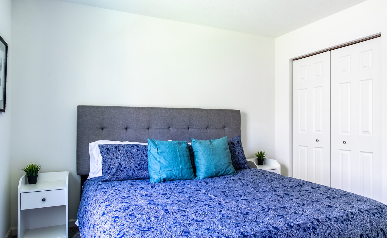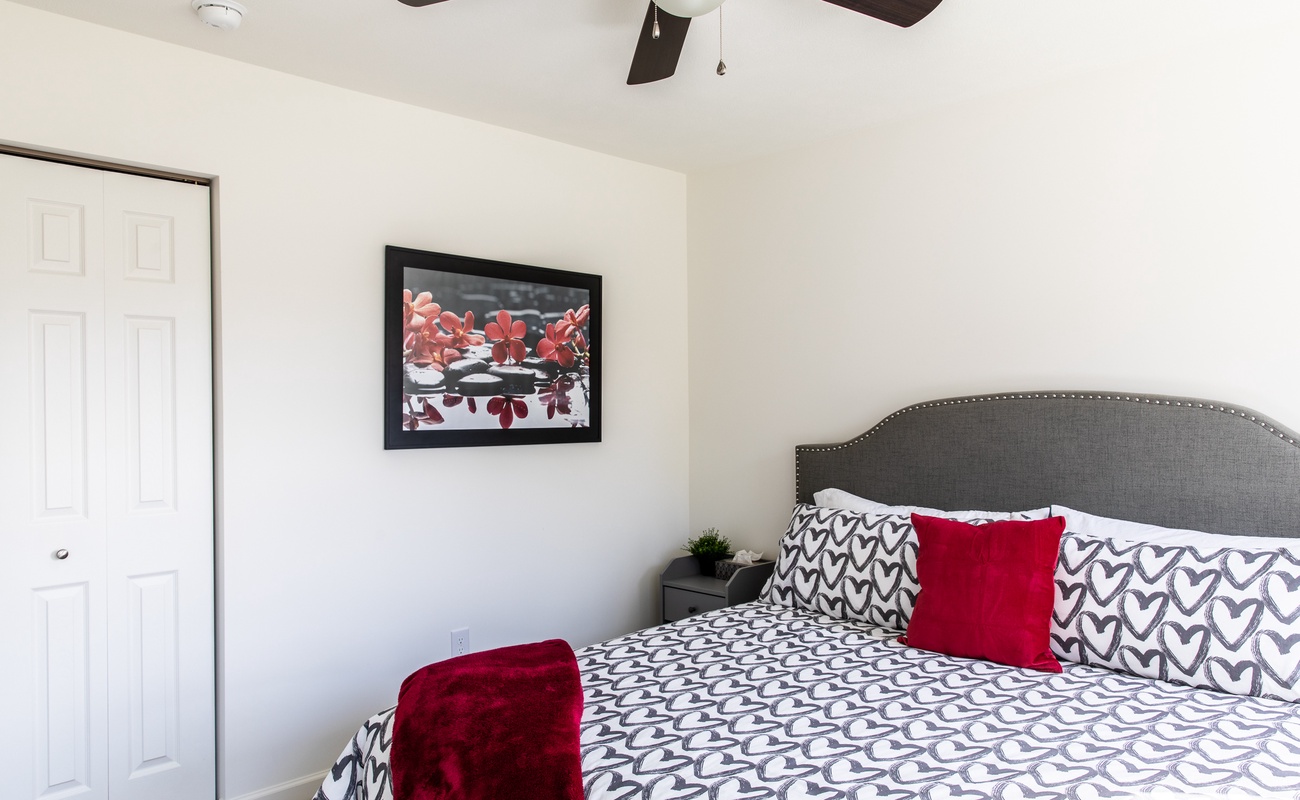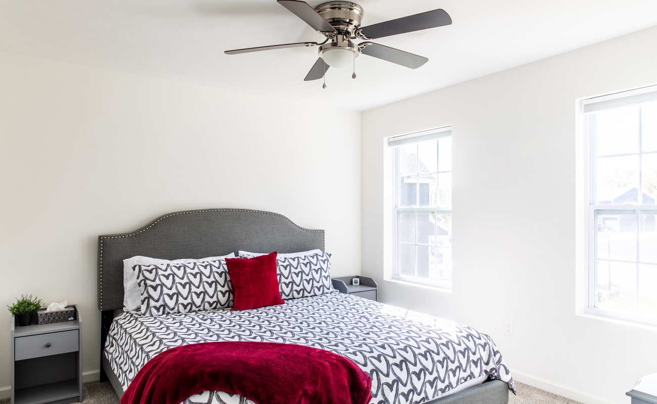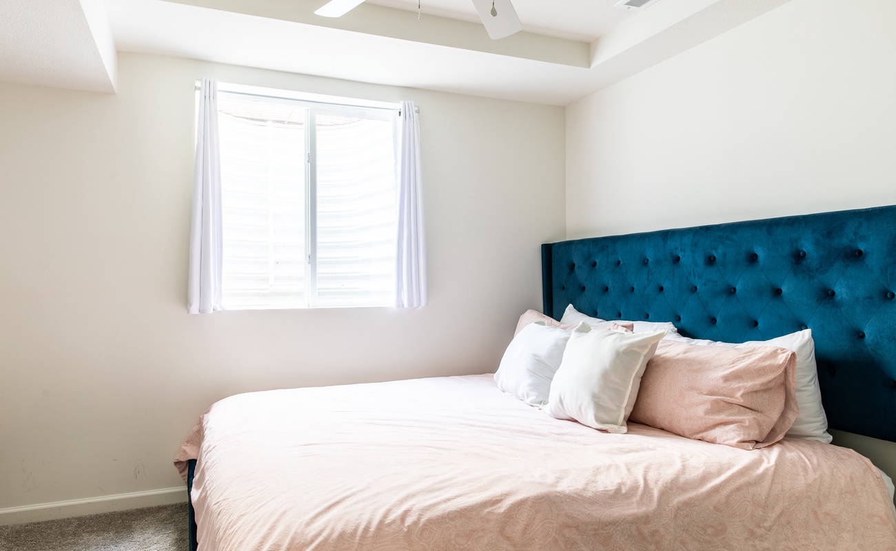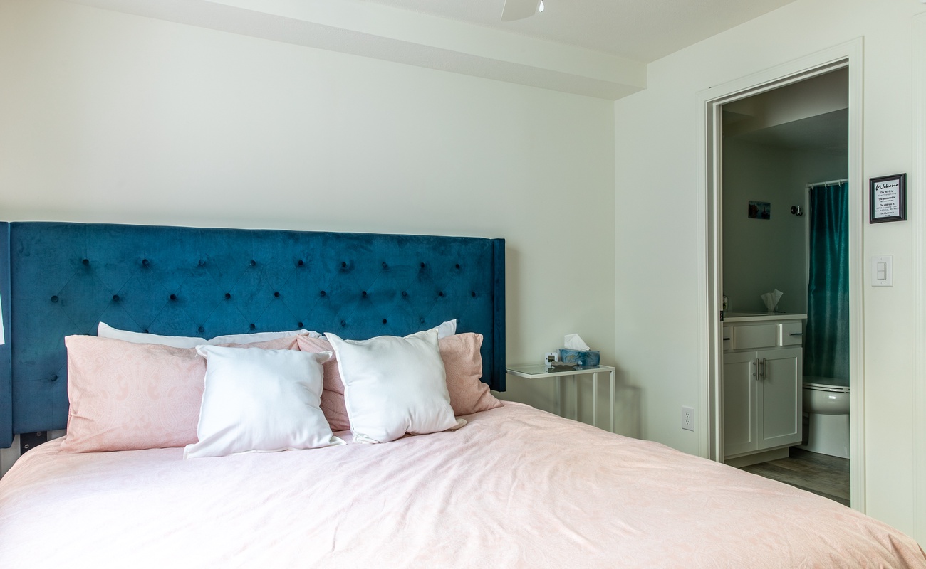 Located in the well-finished basement, includes en suite bathroom. Ceiling fan, black-out blinds