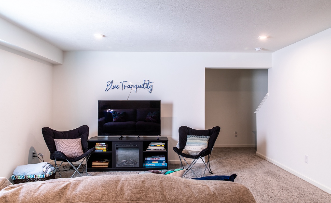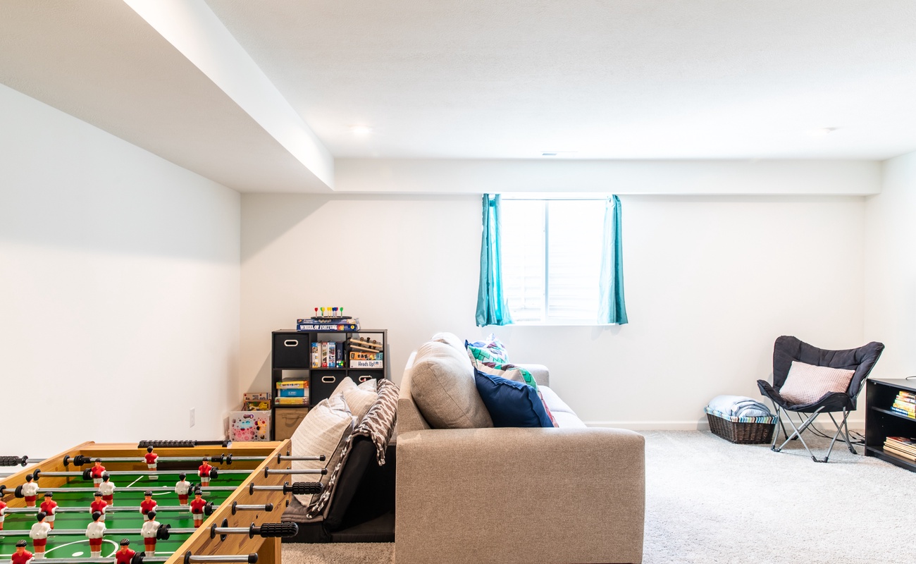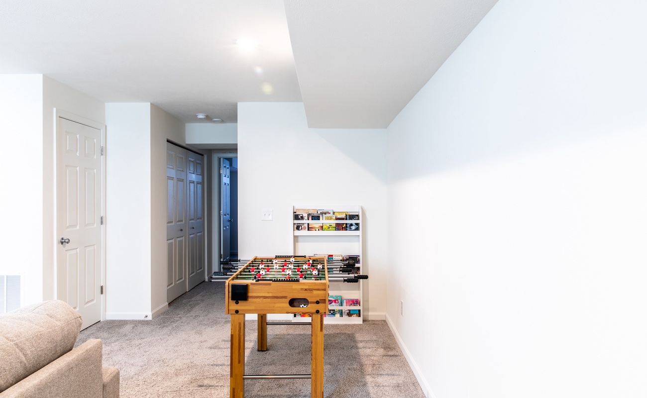 Heading downstairs you’ll find a large living room with a TV, sofa, foosball table, and kids toys & books. Off the basement living room is a full bathroom and bedroom with a cozy new King bed.