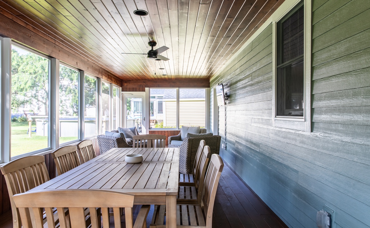 The back of the house is perfect for relaxation. The screened-in porch is runs nearly the length of the home and has space for eating, lounging, watching TV, board games, and lounging. You can enjoy the hot tub right off the enclosed porch or take a few more steps to the pool.