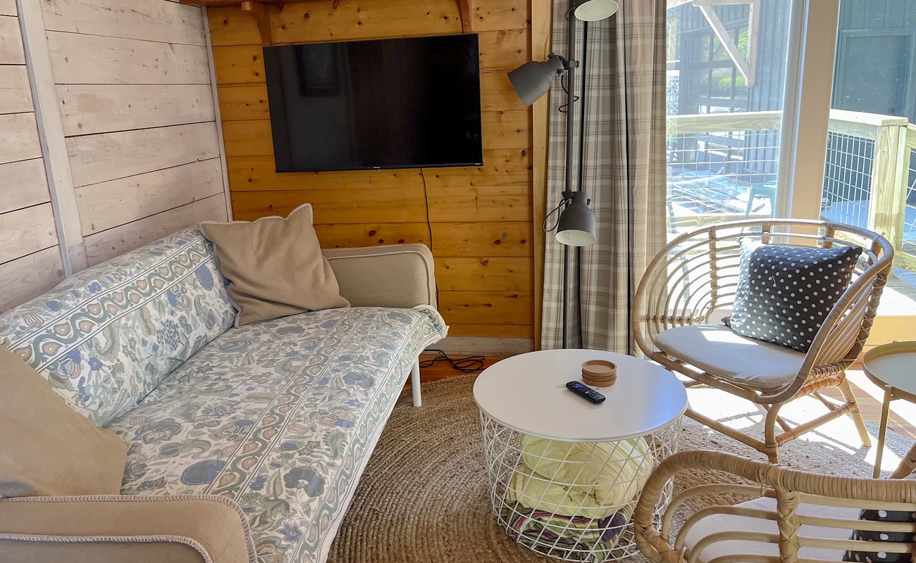 The main living space features an open, vaulted layout that blends lounging, dining, and kitchenette areas into one bright and inviting room.