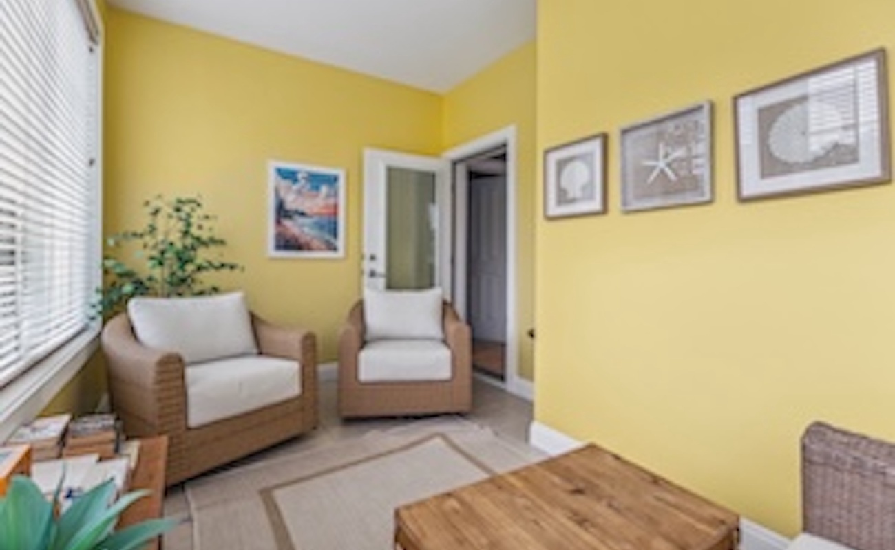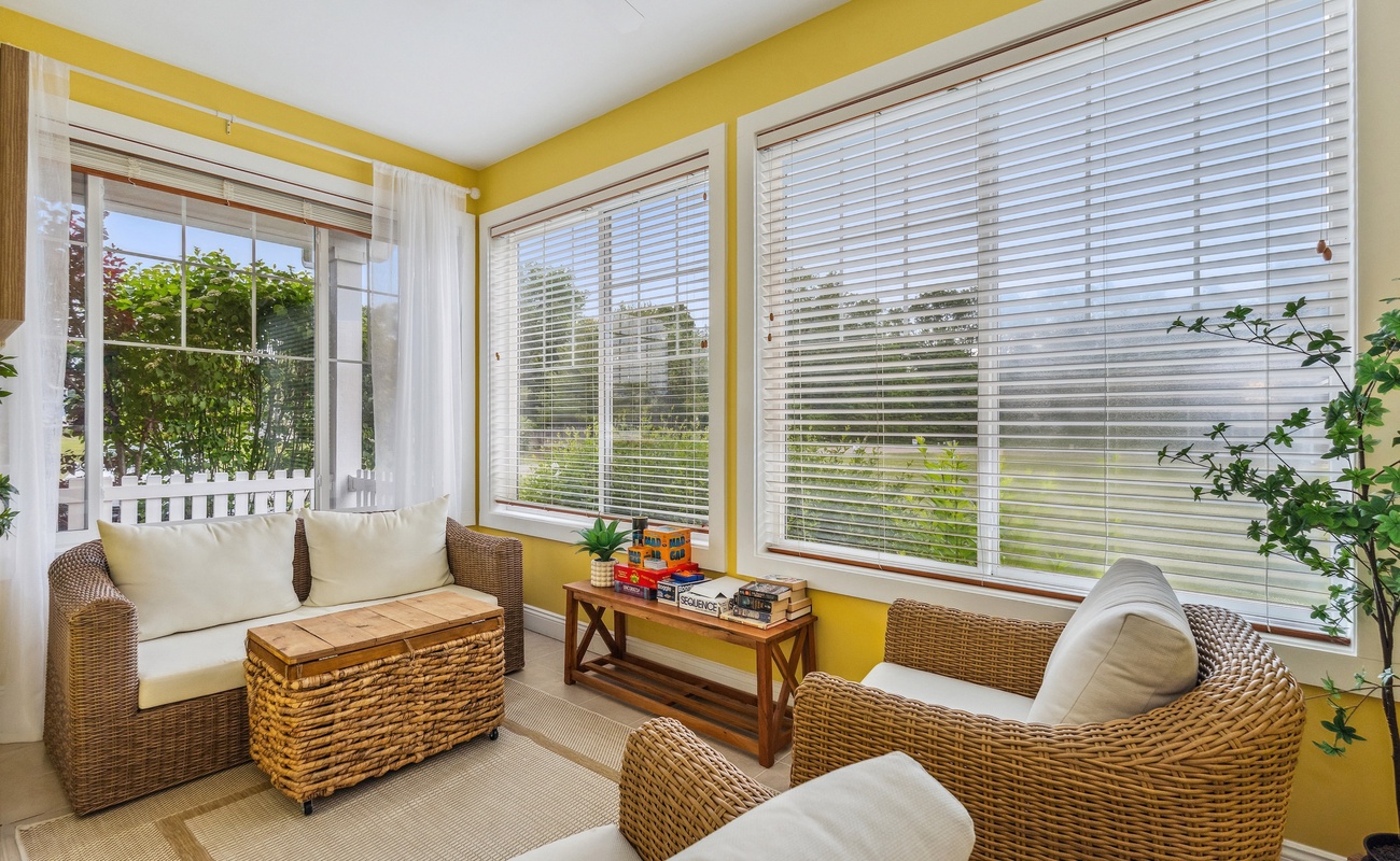 Adjacent to the main living area is a charming sunroom, full of natural light and comfortable seating, the perfect spot to enjoy your morning coffee or curl up with a good book.