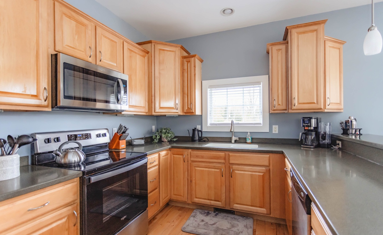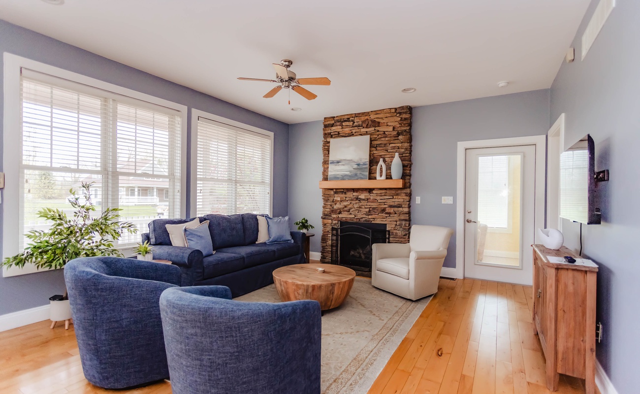 The living room features plush seating arranged around a cozy fireplace and a flat screen TV, perfect for cozying up on cooler evenings. The fully equipped kitchen features modern appliances and ample counter space, making meal prep a snap!