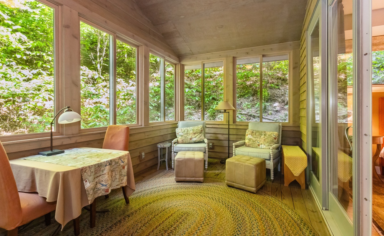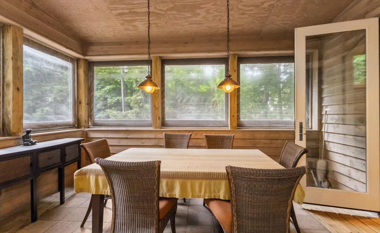 Forest-facing screened porch with a full outdoor dining setup