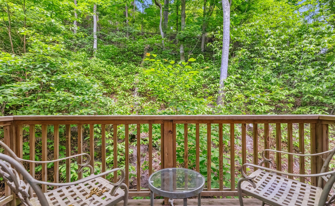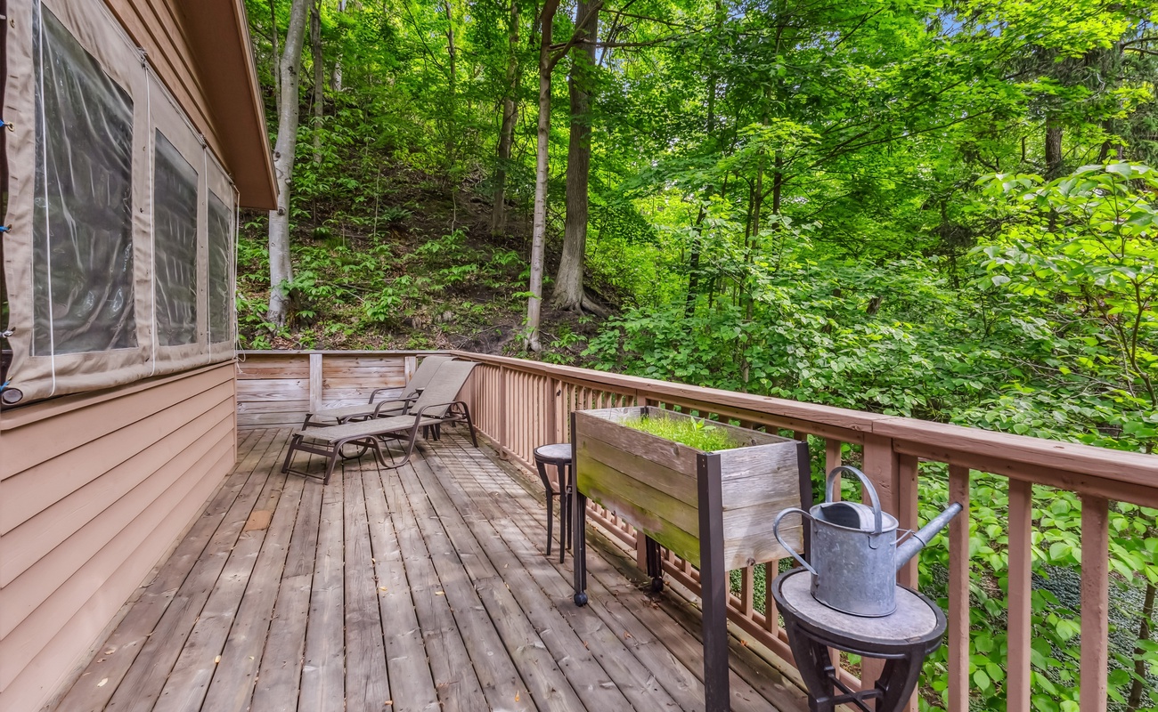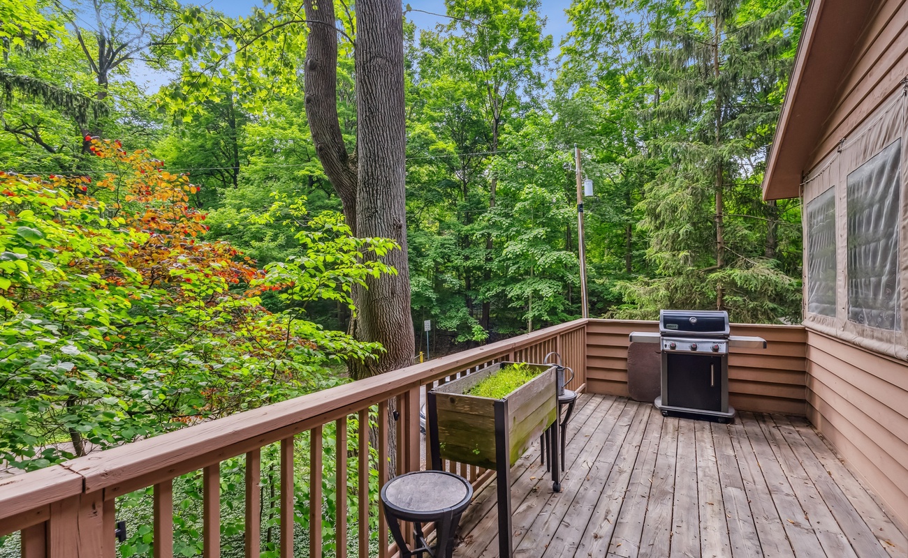 Large wraparound deck nestled in the trees—great for grilling, lounging, or birdwatching