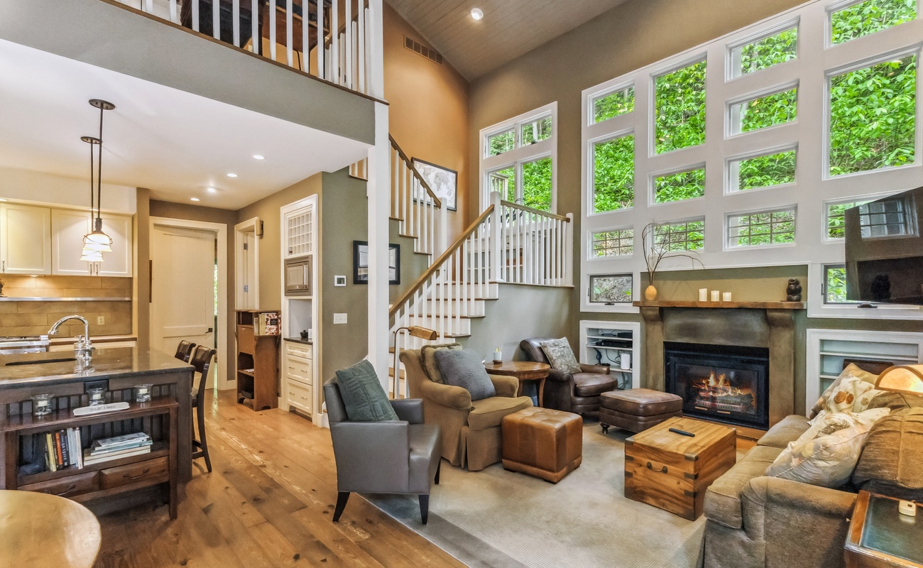 Open-concept living room with a comfy sectional and big windows looking out to the trees