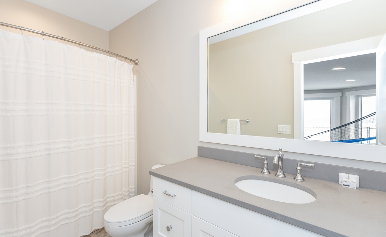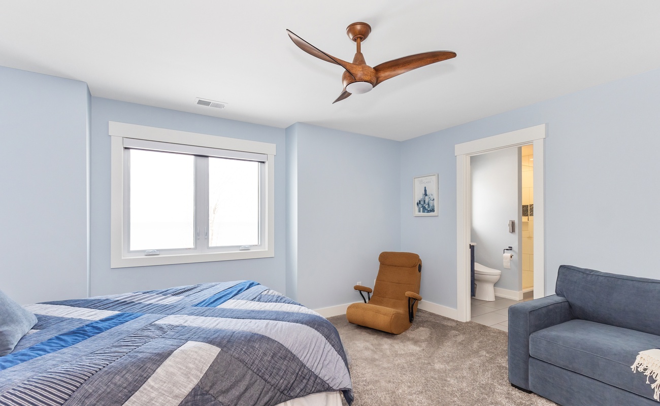 Primary ensuite with large ensuite bathroom and sweeping Lake Michigan Views. Pull out sofa for small children.