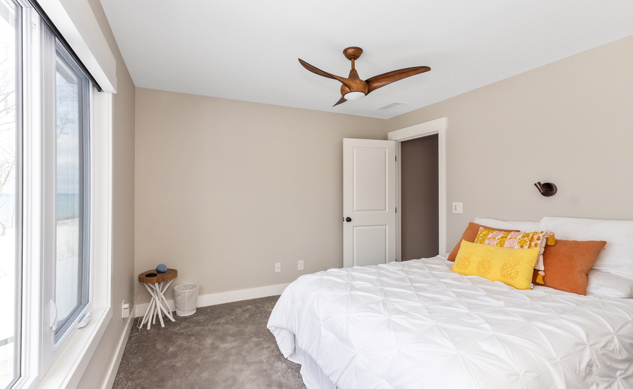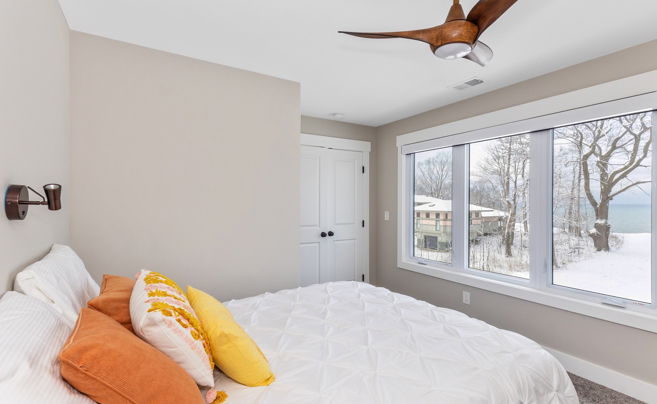 Cozy bedroom with Queen bed and Lake Michigan views