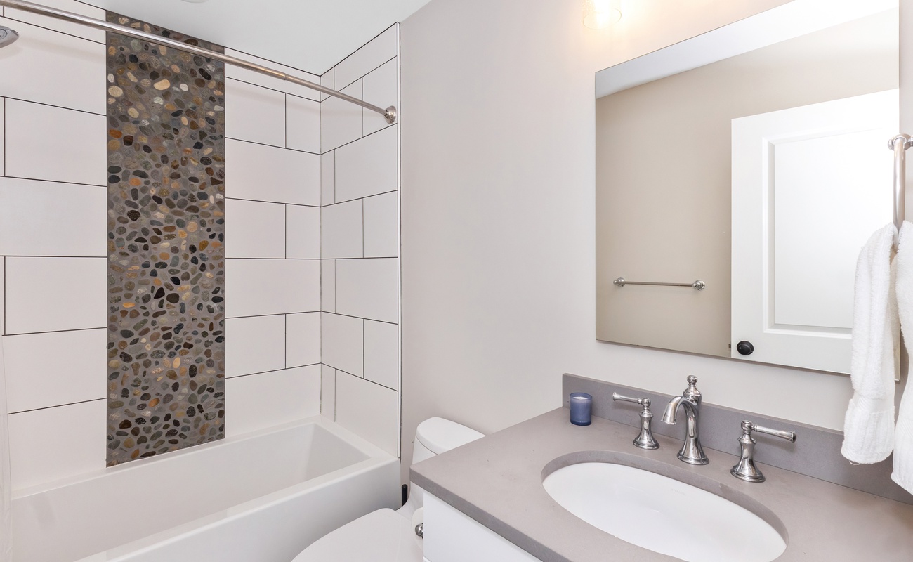 En suite bedroom with Queen bed and full bathroom Single pull-out sofa for kids only