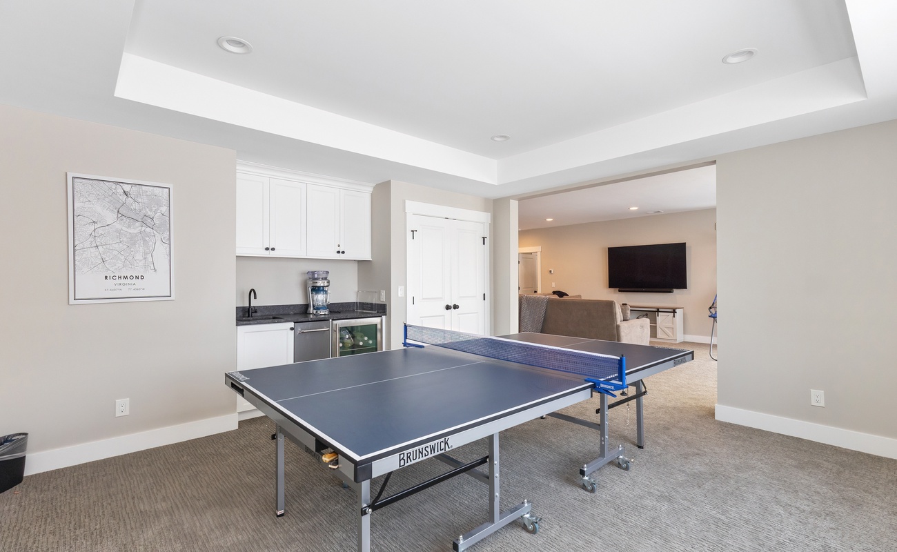 Lower level includes game room, wet bar, and treadmill