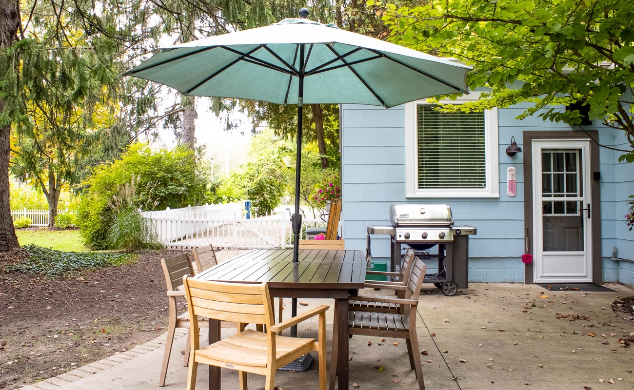 Spacious patio with hard-lined propane grill and outdoor dining table
