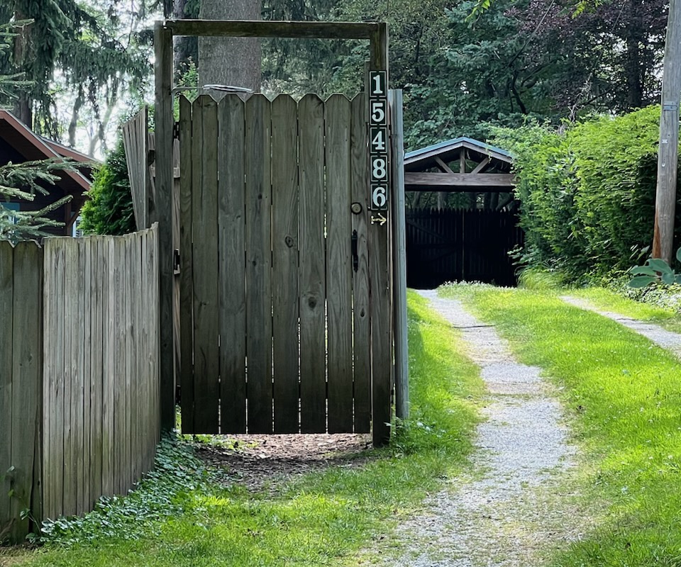 Walk south on Lakeshore Road to the private neighborhood gate (key provided)