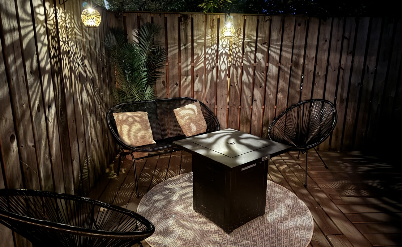 J's does not have a fire pit but there is a fireplace for relaxing during a movie or game night!
