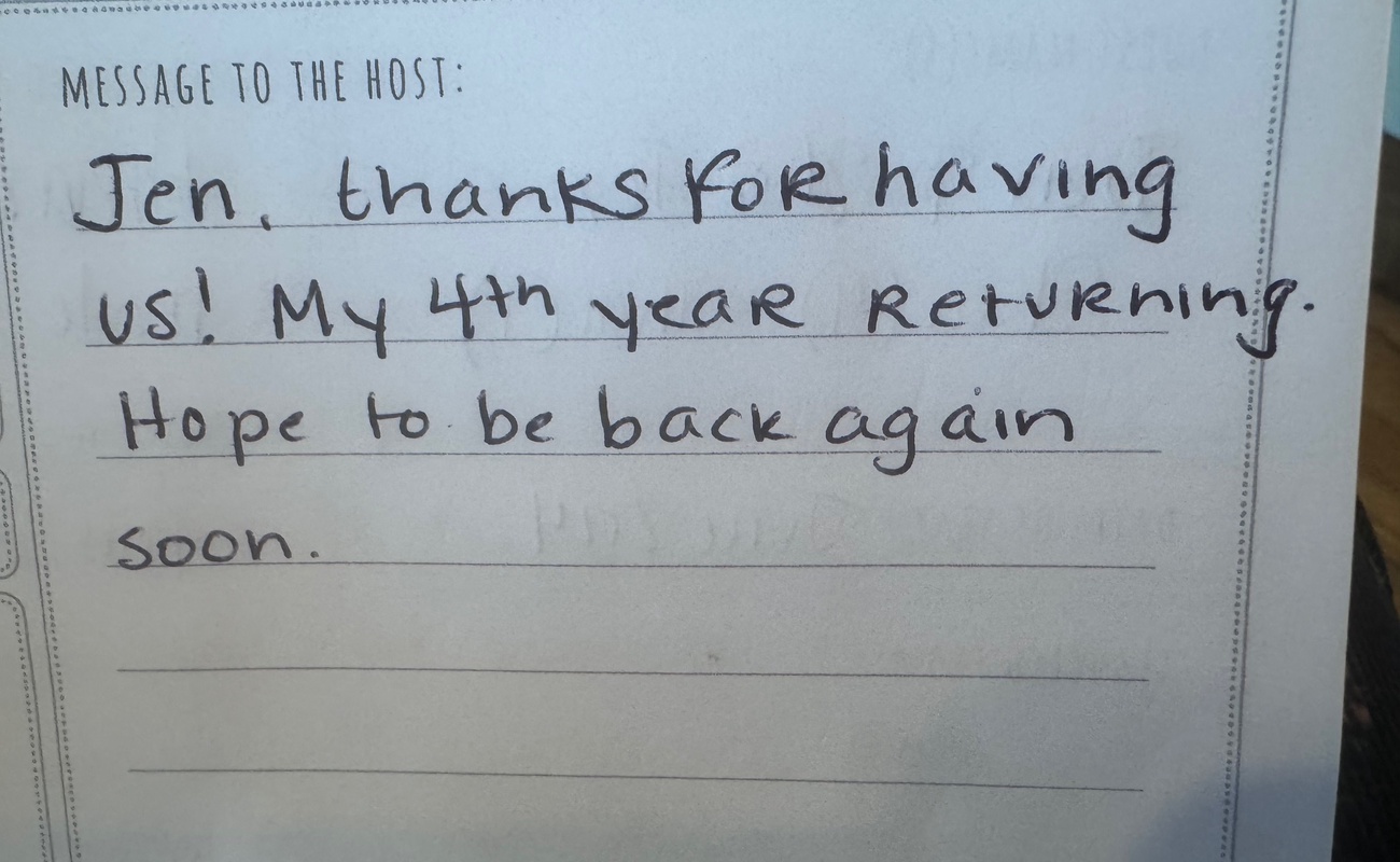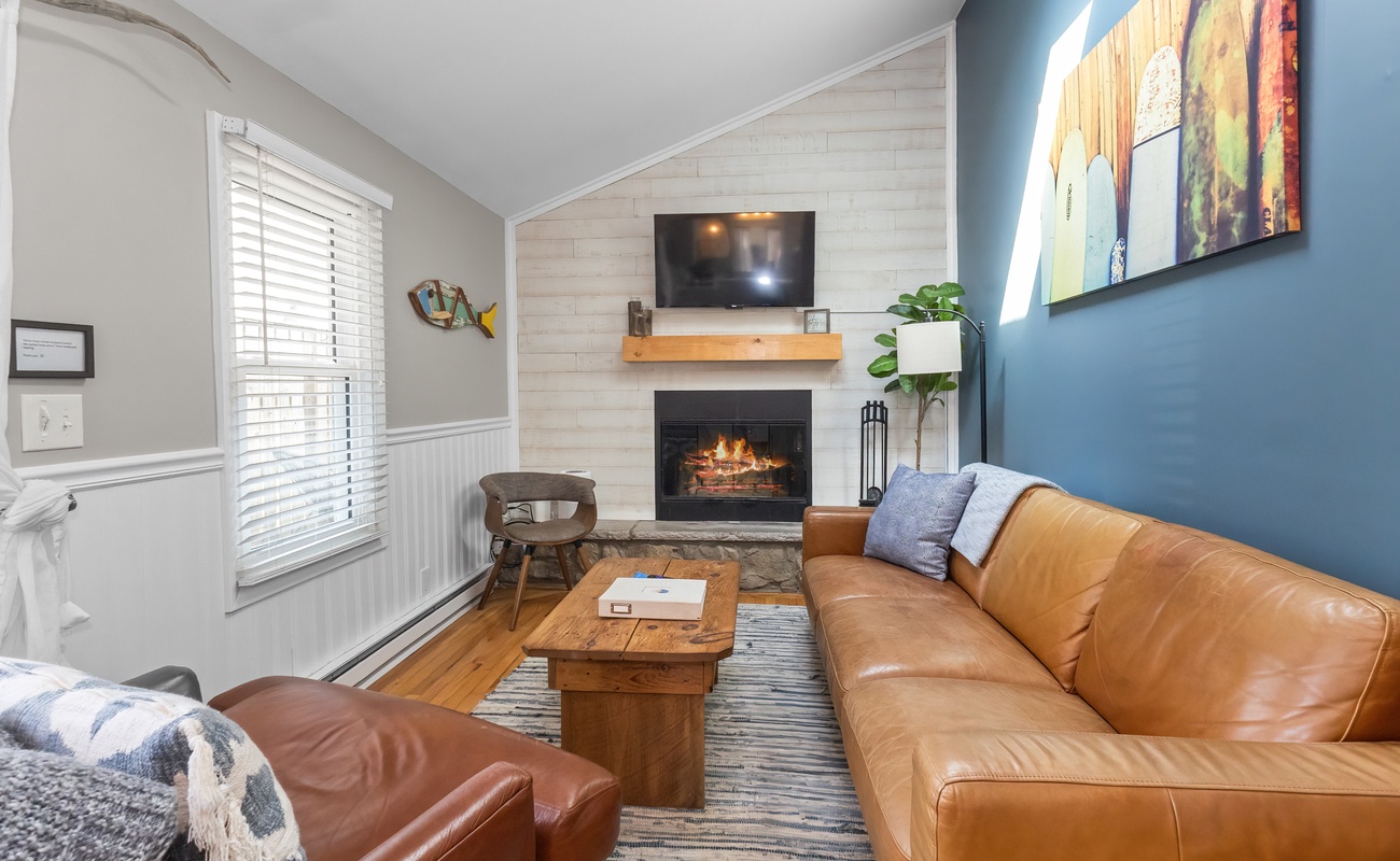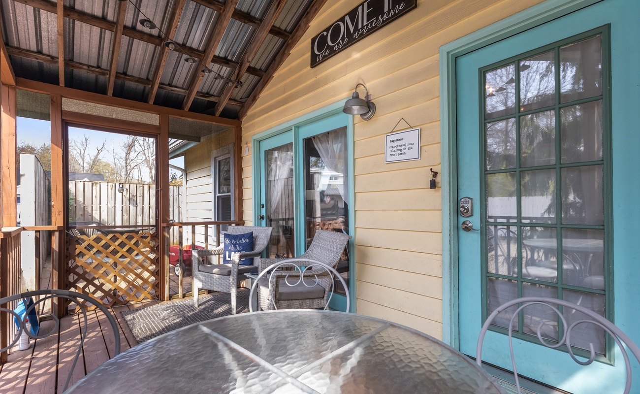 The cottage has a 3-person couch, oversized chair and additional seating so you can lounge in the living room. There are board games and a Bluetooth speaker by the fire place. There is a 4-person kitchen table that straddles the kitchen and living room. The screen porch faces the driveway and has string lights, 4-person table and two sitting chairs.