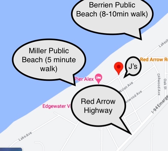 There are multiple neighborhood beaches nearby in addition to the Center Ave beach mentioned above. Simply walk north to Berrien St. Beach (no stairs, just a sandy path down to beach level) or Miller St. Beach (stairs, but closer to property).