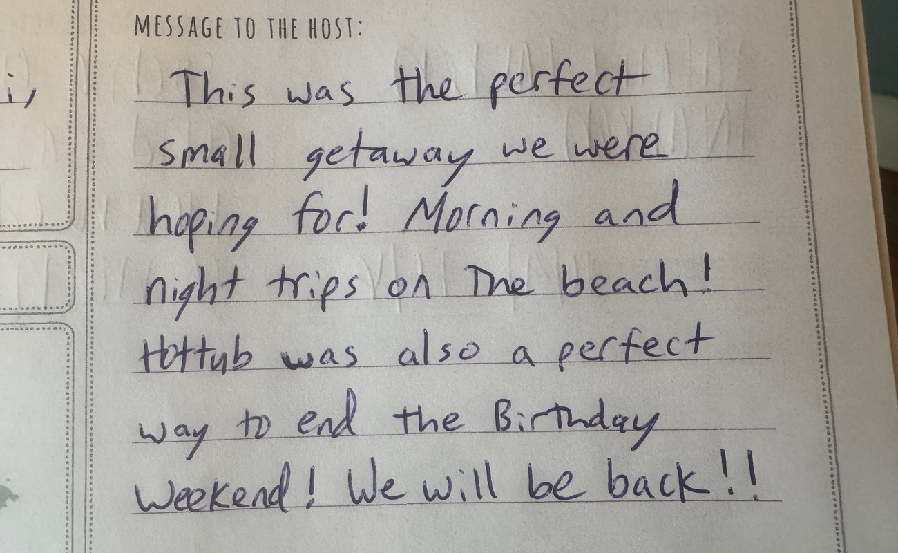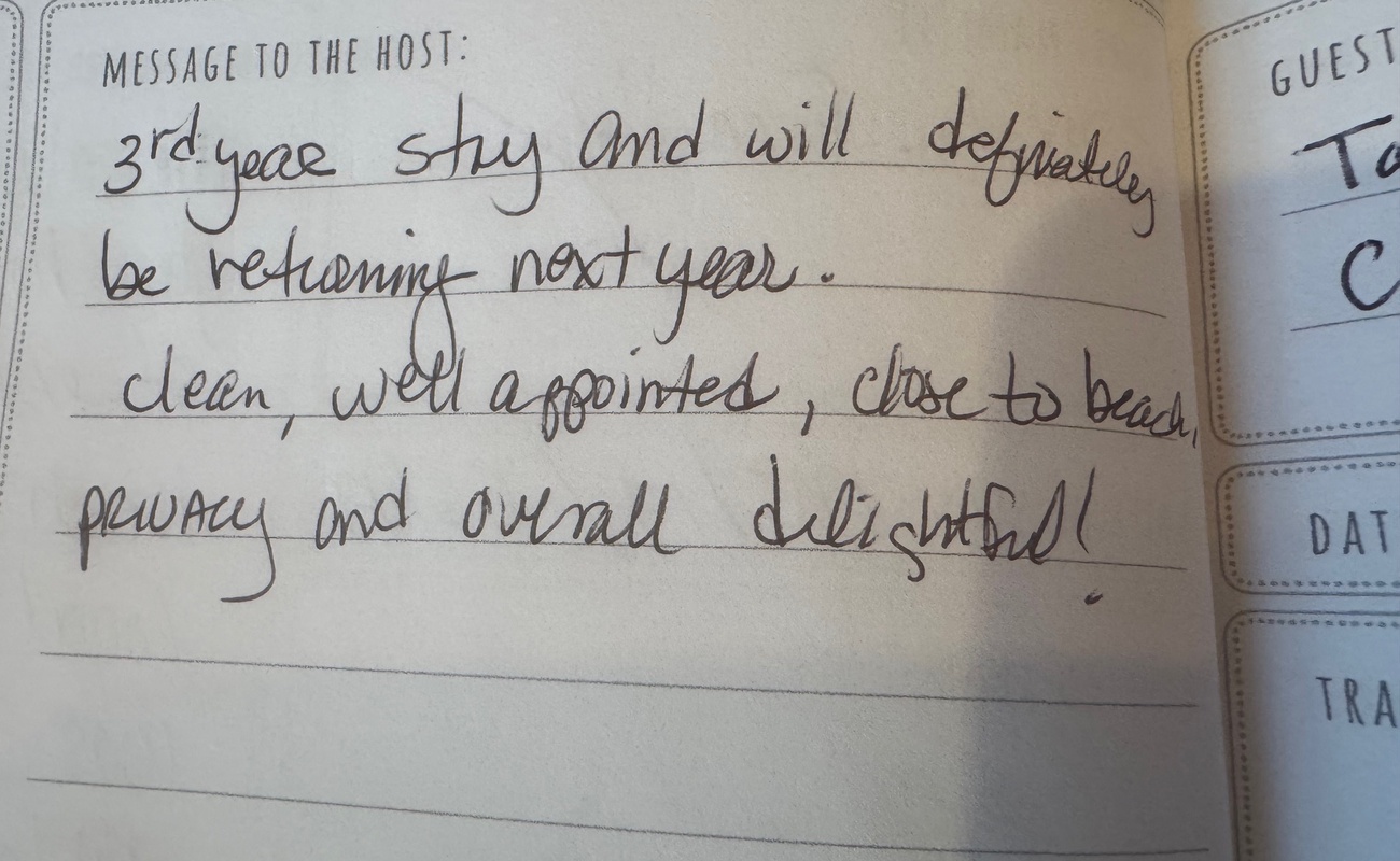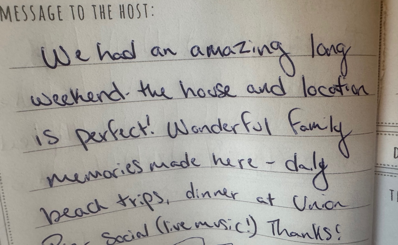 The cottage is equipped with a full-size kitchen for eating in and a charcoal grill next to the deck. A booster chair can be found in the bedroom closet.