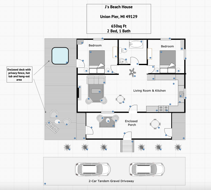 J's Beach House is a super cute and remodeled cottage equipped with a private hot tub and fireplace. The location is terrific, less than 1000 feet from the Center Ave neighborhood beach! Enjoy the beach, walk to downtown Union Pier for coffee and treats, or jump in your car for a quick drive to any Harbor Country activity!