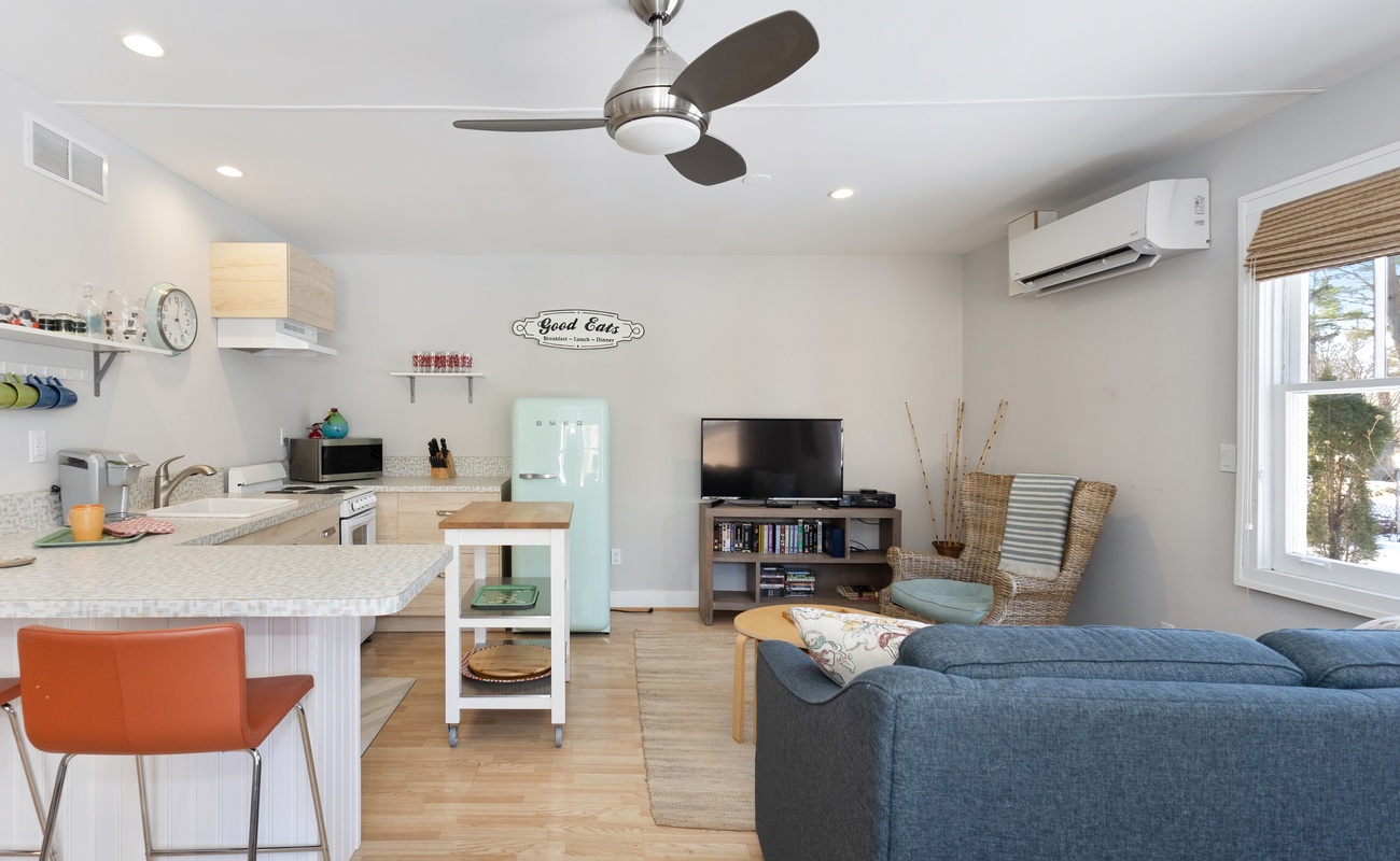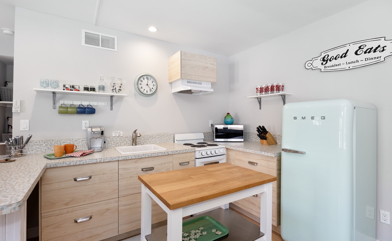 Step inside the spacious main house, where the open-concept living area is bright, beautifully furnished, and set up for relaxation. Whether you’re enjoying a nap after a day at the beach or gathering with friends and family, the main living space is perfect for connection. The large, fully equipped kitchen is ready for anything, whether you're prepping a large breakfast before heading to the beach or mixing up cocktails for a laid-back evening.