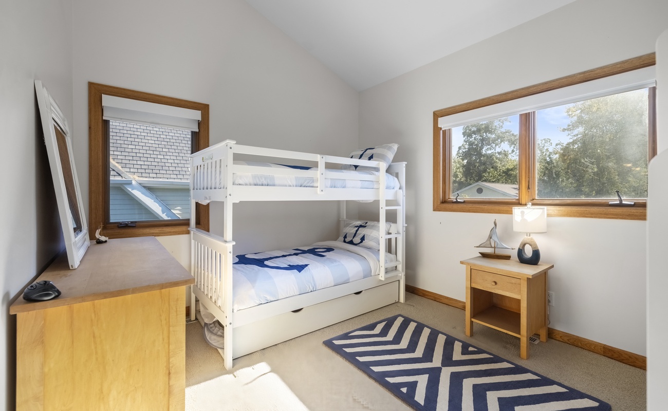 • Two twin bunk beds + trundle (sleeps 5)