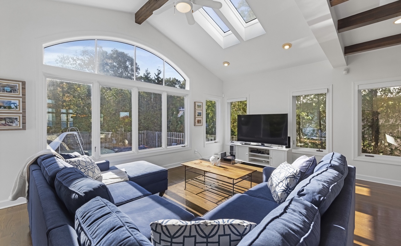 • Open-concept living room with abundant natural light and lake views