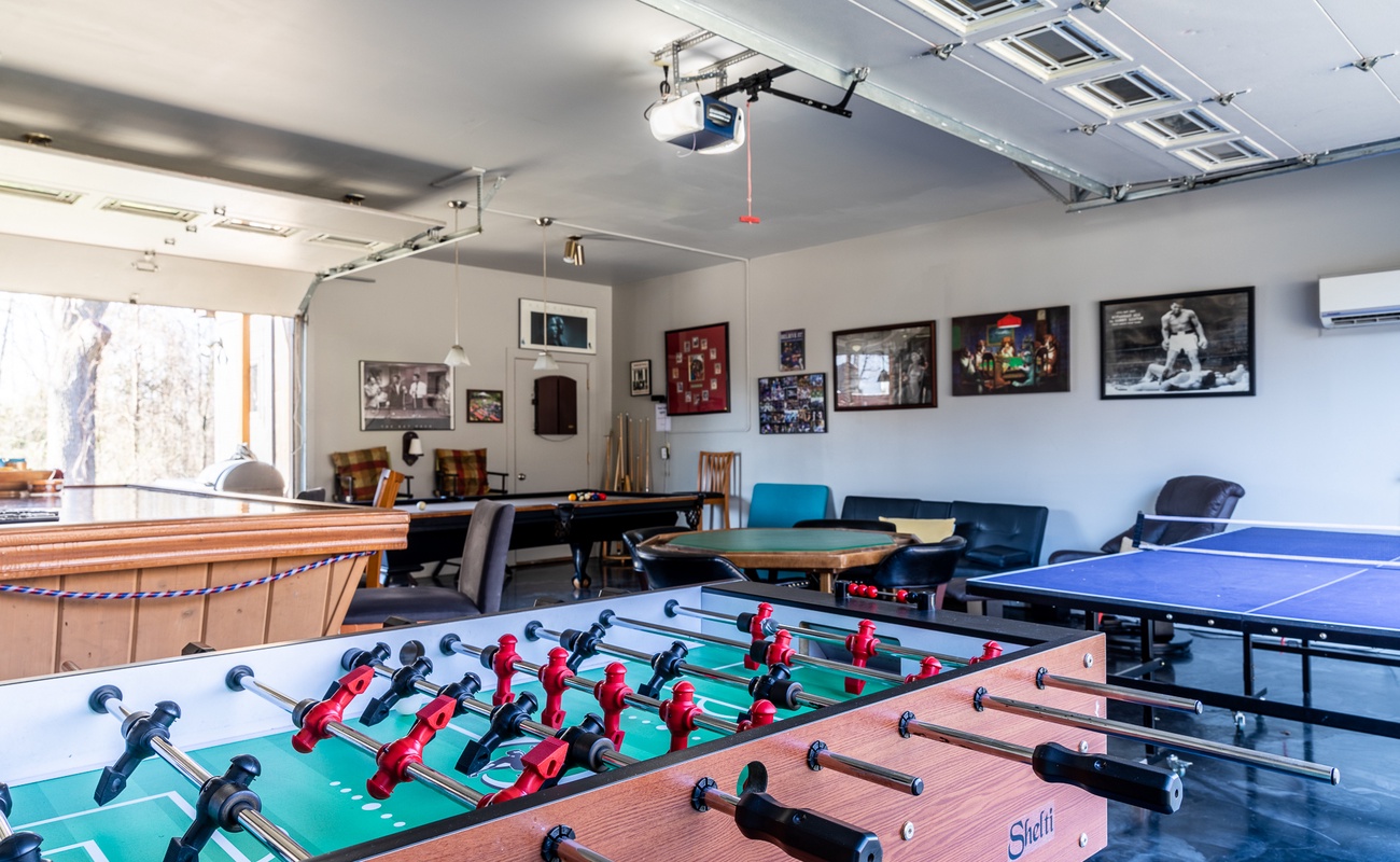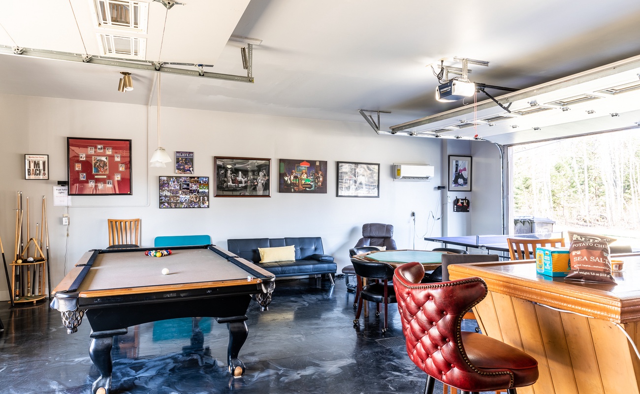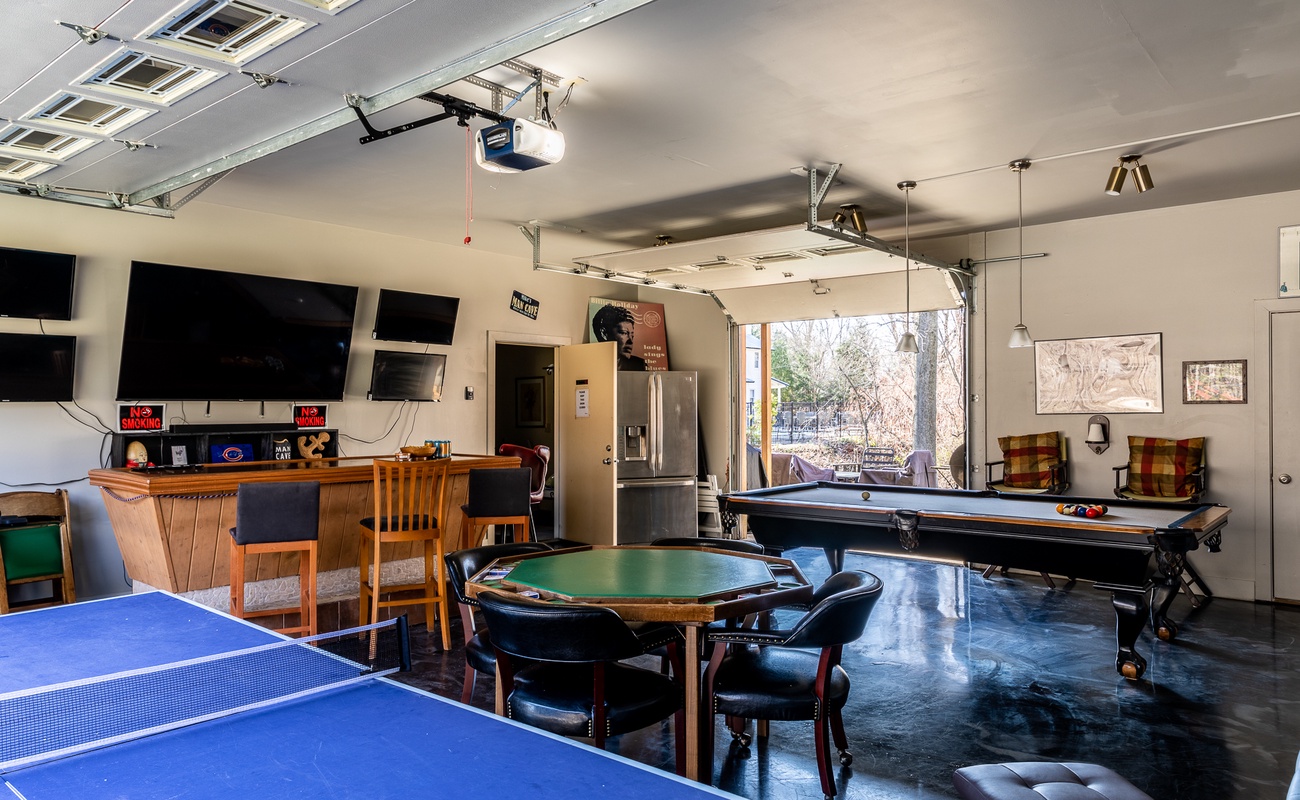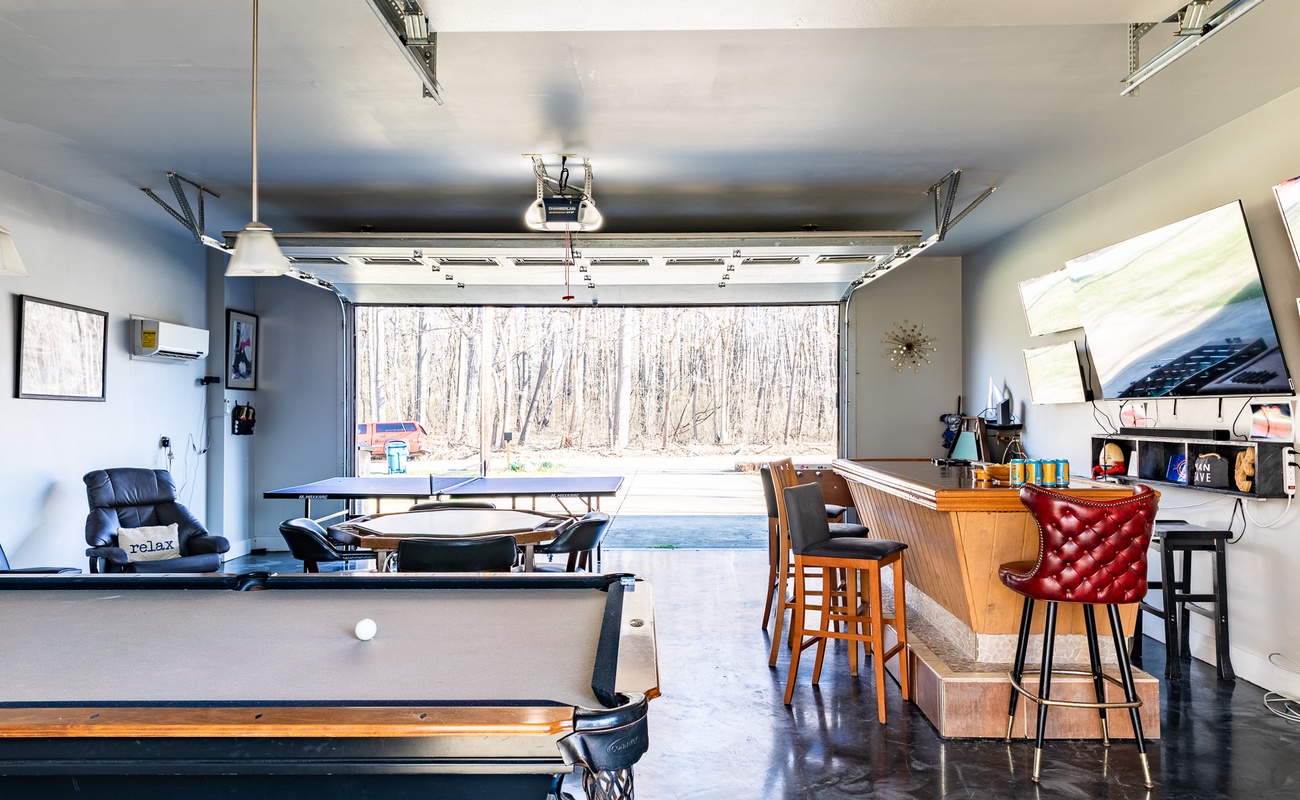 The access to the garage and downstairs is through the living area and the garage is set up for a great social space with tables, pool table and many other items. The basement is the main TV entertainment area with full bath also for the smaller kids to tuck away from the adults.