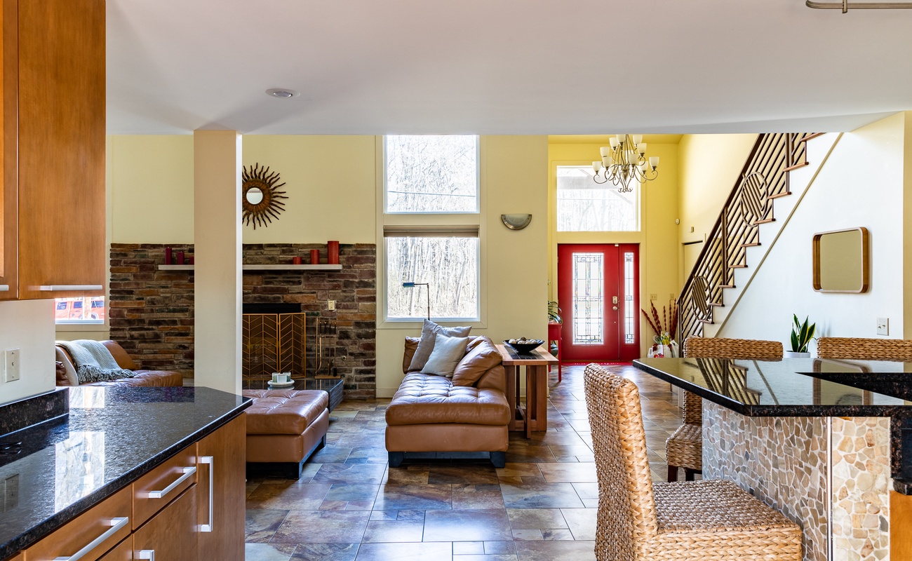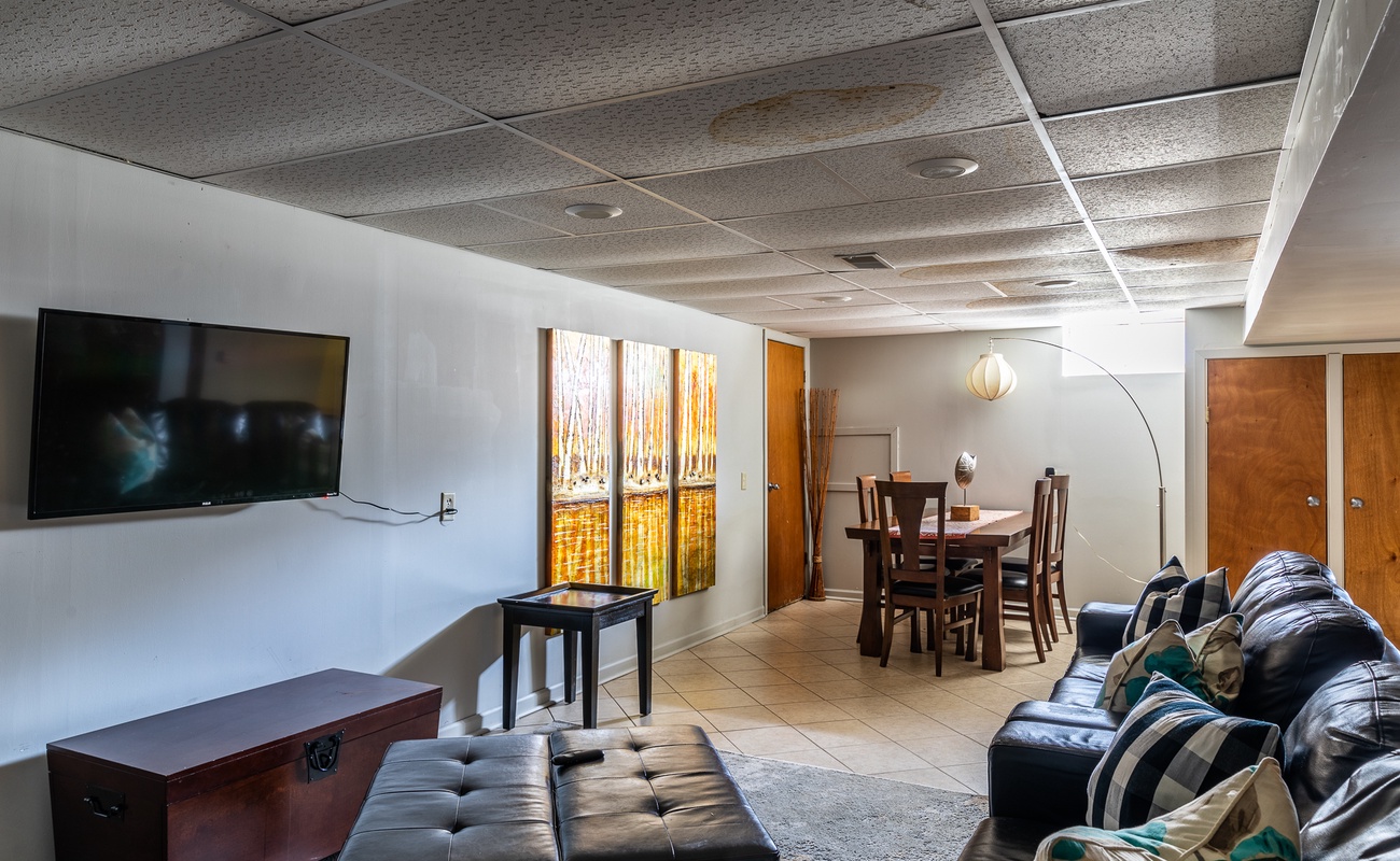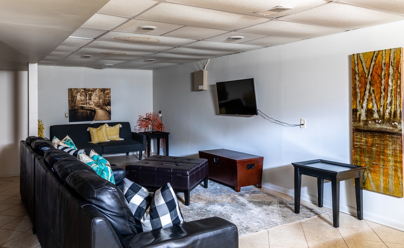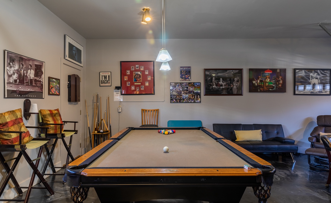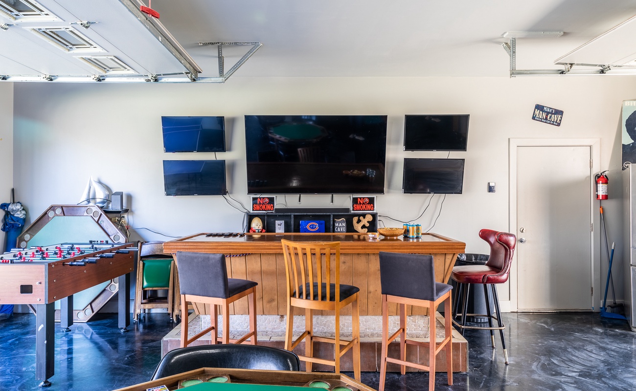 The access to the garage and downstairs is through the living area and the garage is set up for a great social space with tables, pool table and many other items. The basement is the main TV entertainment area with full bath also for the smaller kids to tuck away from the adults.