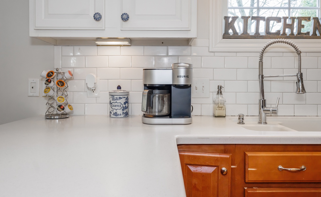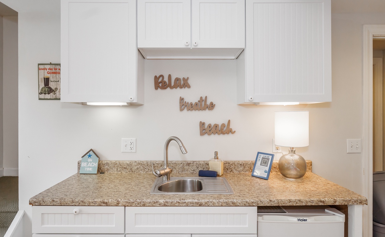 Extra hangout space with a wet bar, mini fridge, and counter for snacks