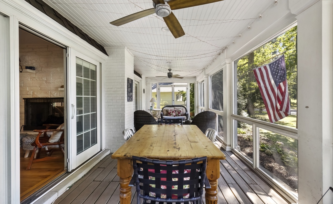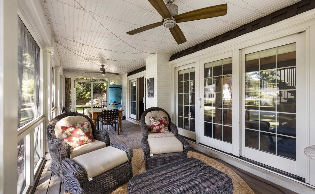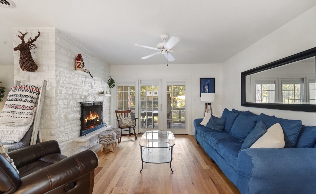 The main living area features an open layout with cozy seating, a fireplace, and large windows that fill the home with natural light. The modern kitchen includes stainless steel appliances, plenty of counter space, and all the essentials for easy at-home dining. It flows seamlessly into the dining area, which opens to a screened porch—ideal for morning coffee or evening cocktails surrounded by nature.