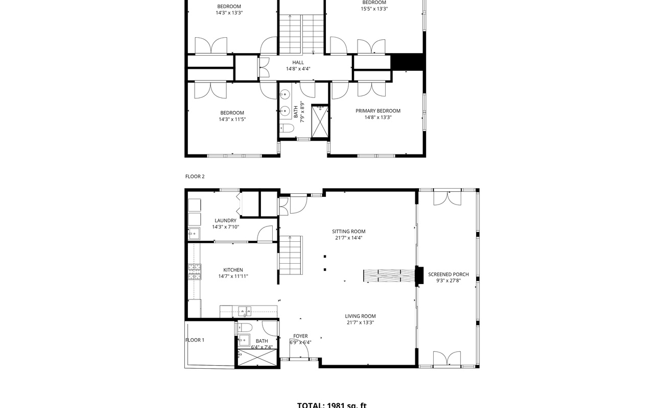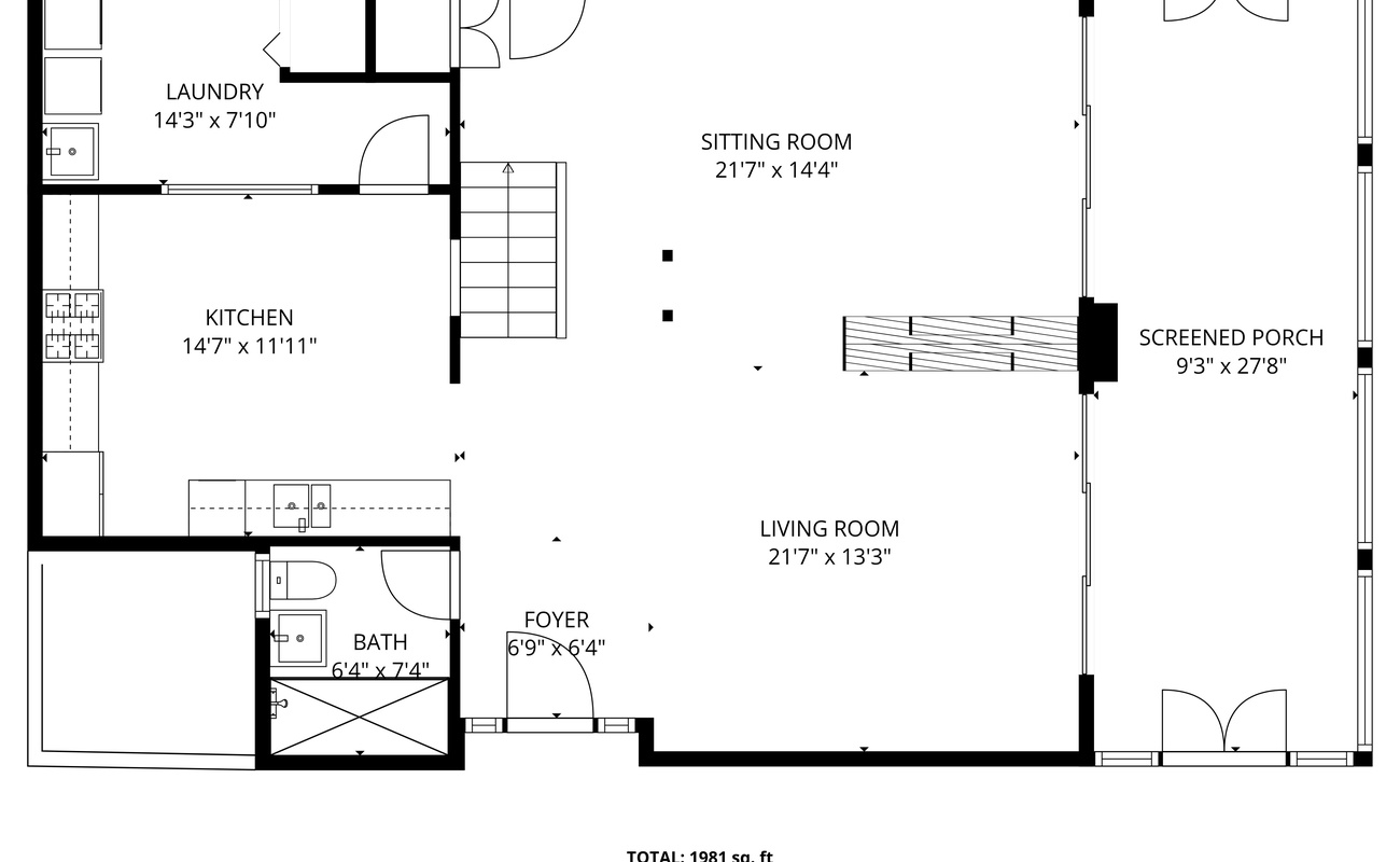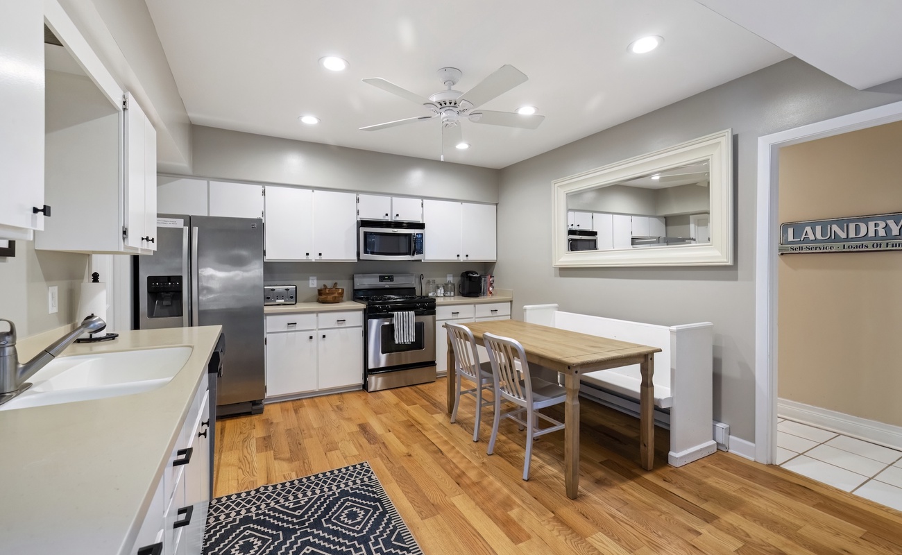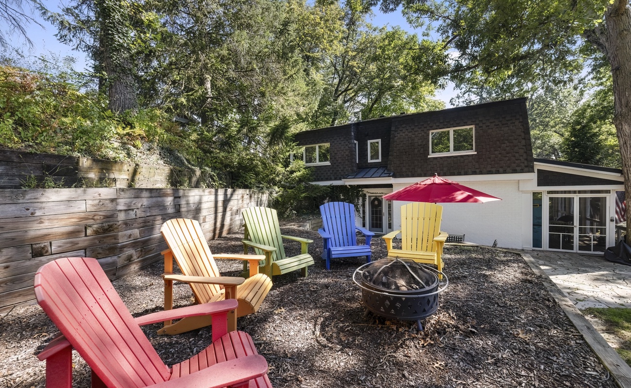 The main living area features an open layout with cozy seating, a fireplace, and large windows that fill the home with natural light. The modern kitchen includes stainless steel appliances, plenty of counter space, and all the essentials for easy at-home dining. It flows seamlessly into the dining area, which opens to a screened porch—ideal for morning coffee or evening cocktails surrounded by nature.