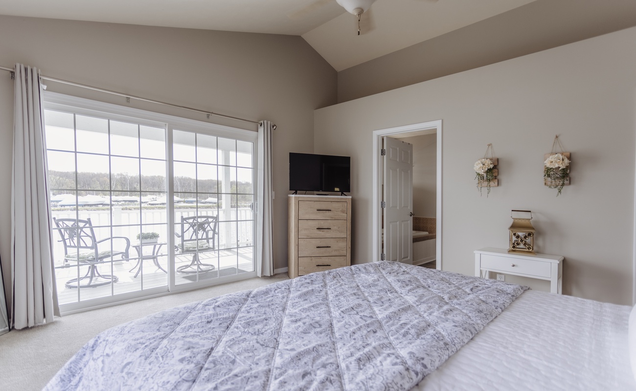 Main bedroom with ensuite bathroom and tub. Bedroom overlooks the river and has a covered balcony