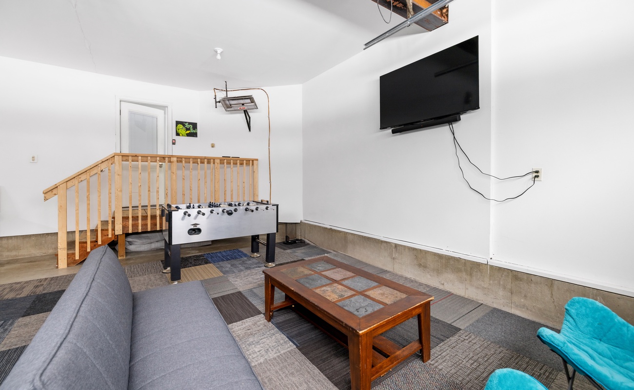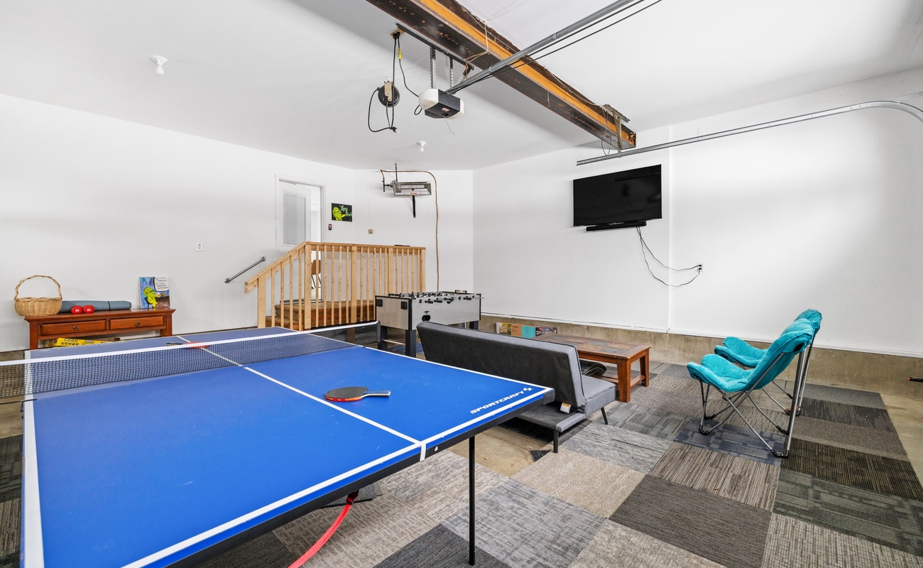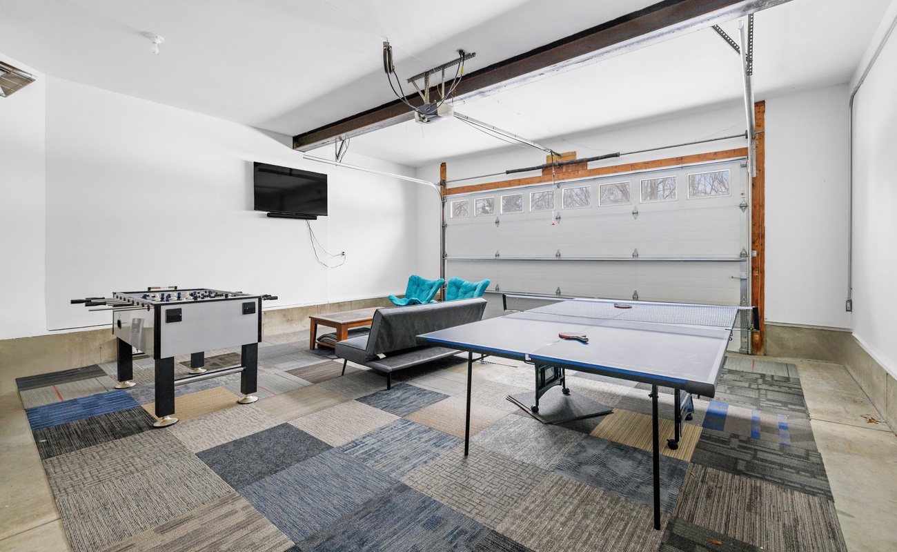 The garage has been transformed into a heated recreation space, creating a fun indoor hangout for all ages.