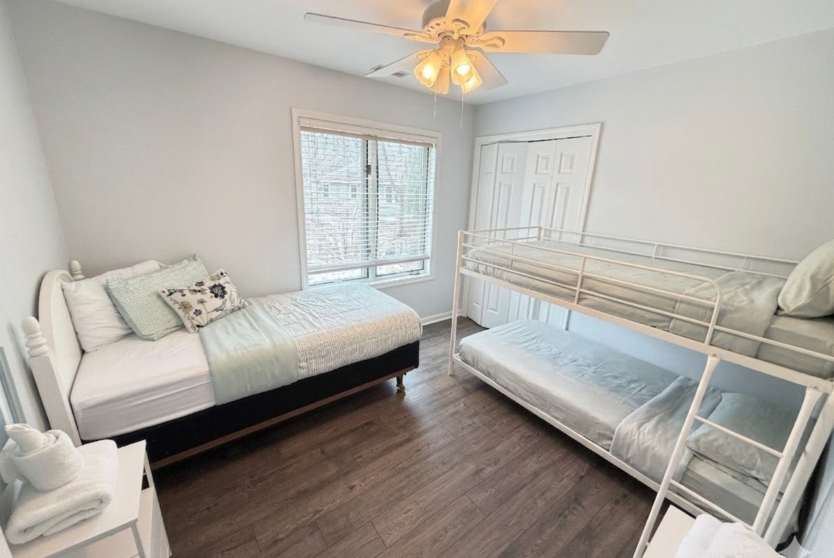 Fun bedroom with a single twin bed and one set of bunk beds.