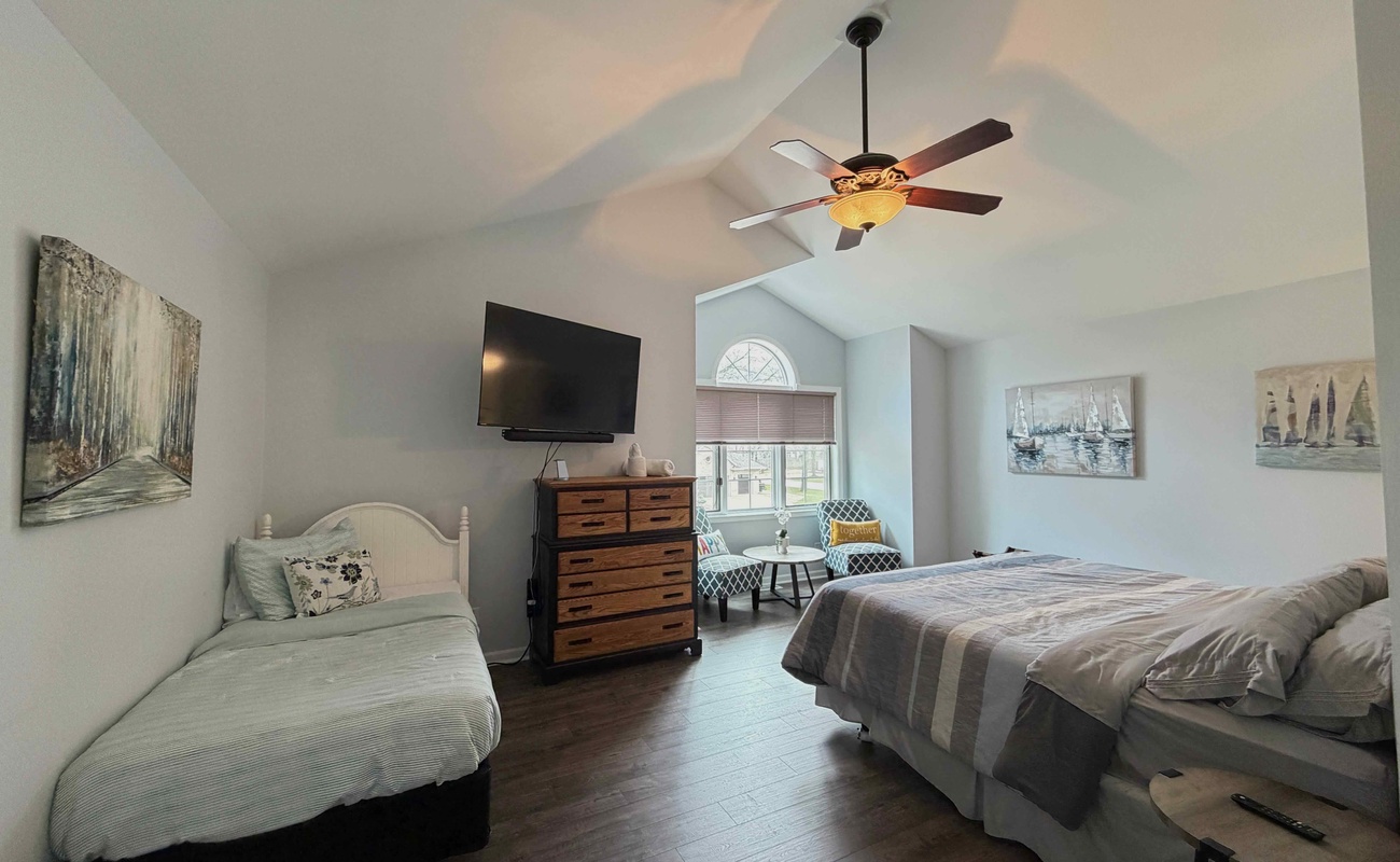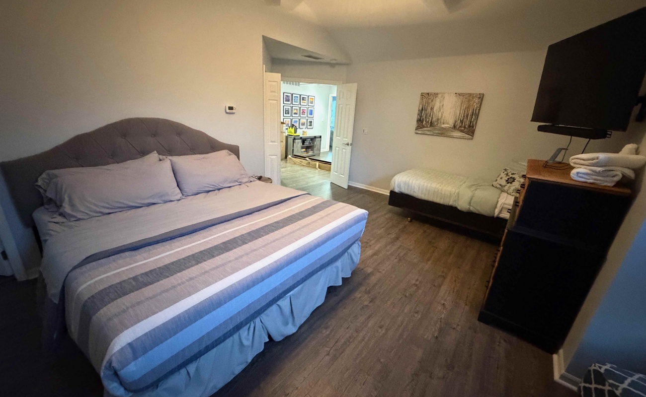 Primary bedroom with a King bed, a Twin bed, TV, and seating with a large ensuite bathroom