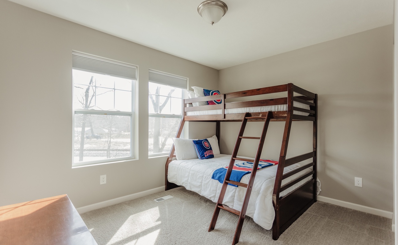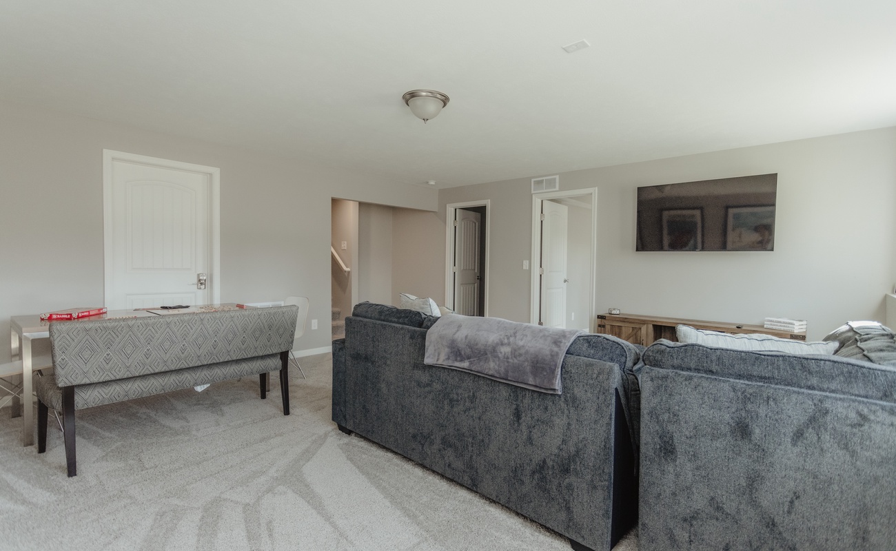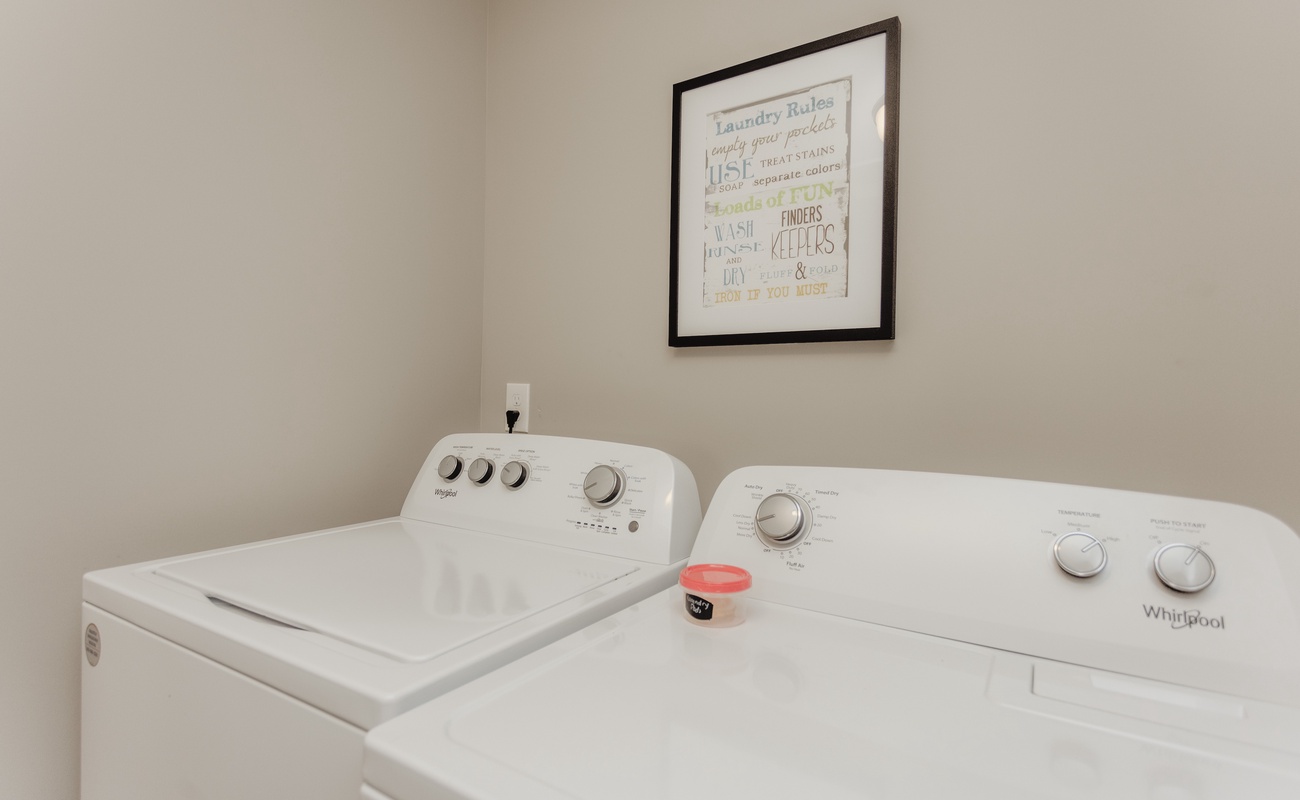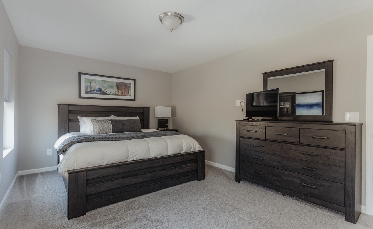 The bedrooms are scattered around the first and third levels of the home. The first level features a nice family room with a sectional in front of a Smart TV, a private bedroom, and a full bath with a standalone shower. The remaining four bedrooms, along with two full baths and a laundry room are located on the upper level of the home. The main bedroom has its own en suite bath with a standalone shower, while the other three bedrooms (one of them being a bunk room) share a full bath in the hallway.