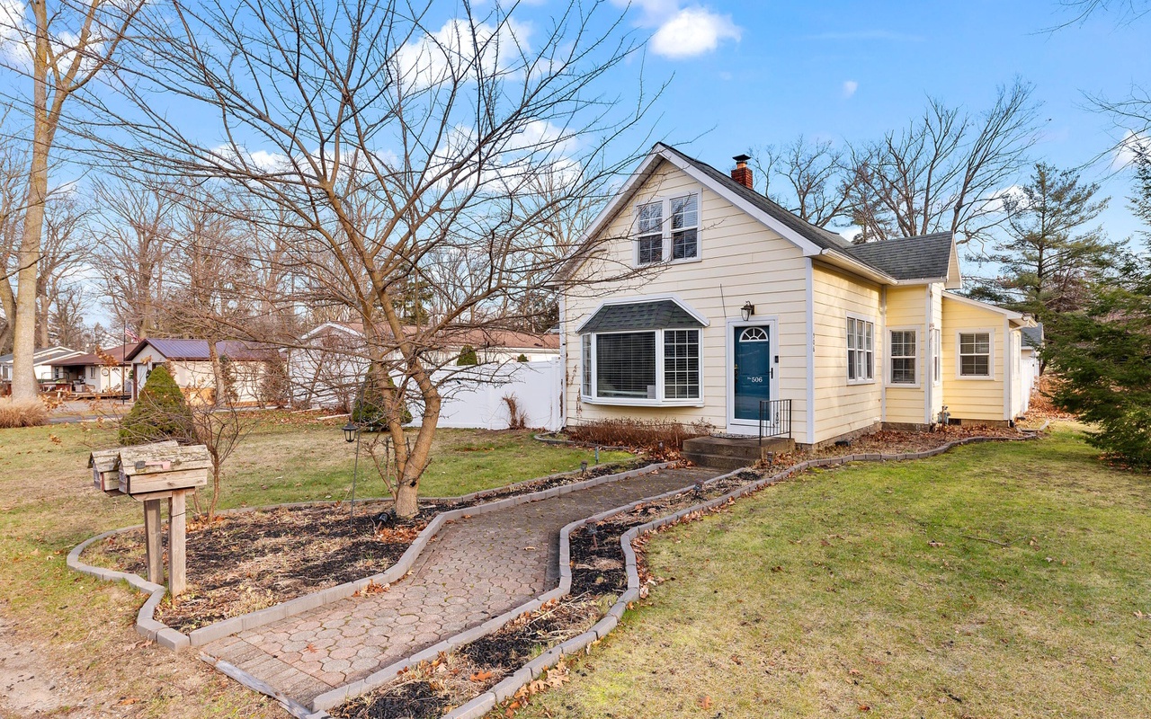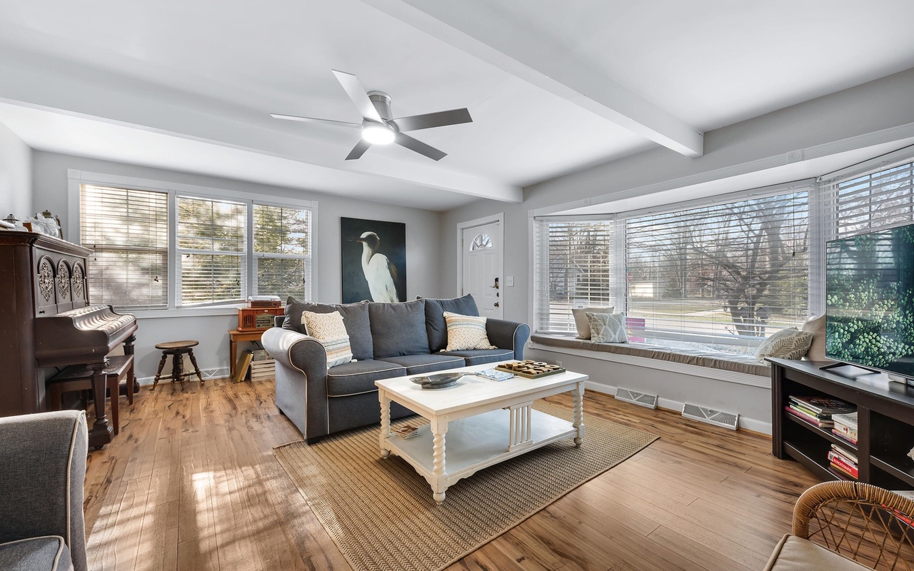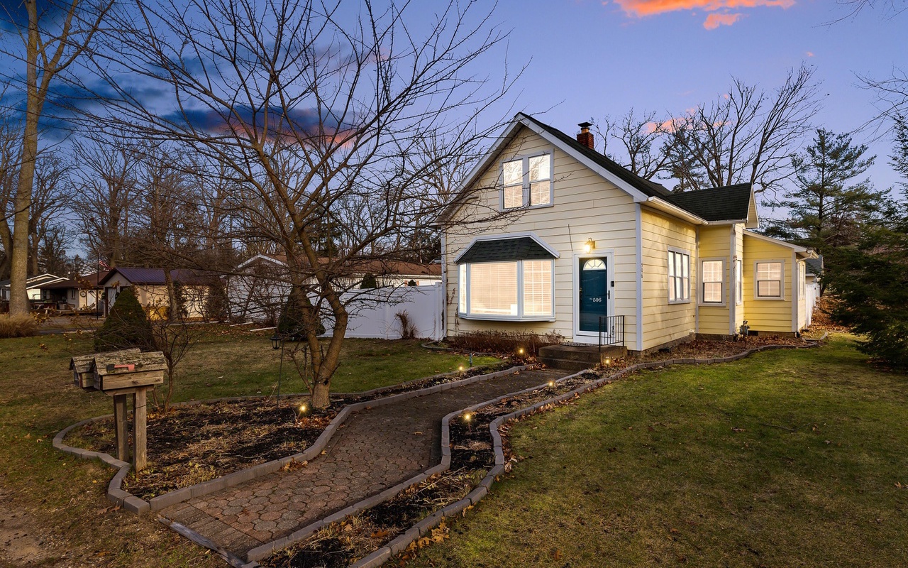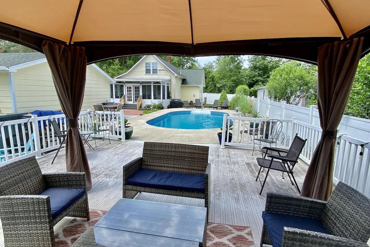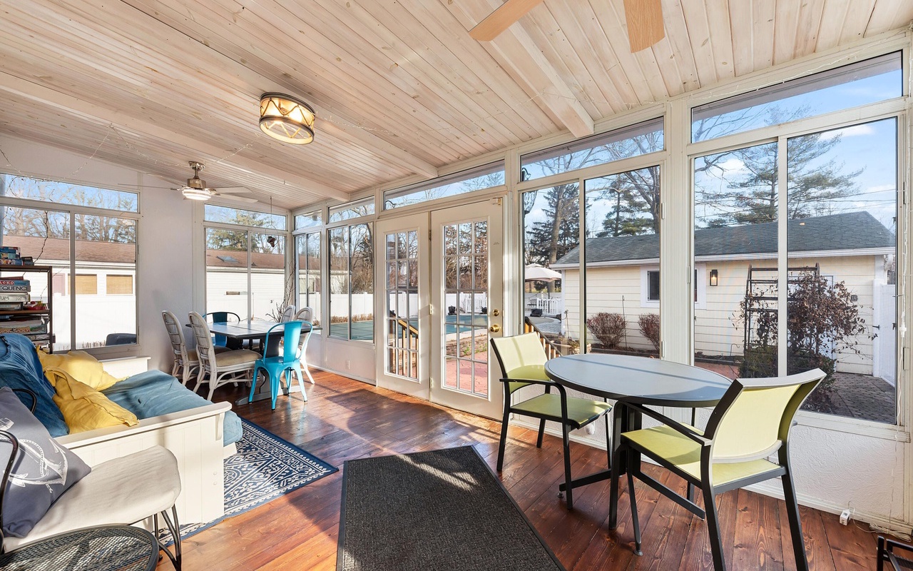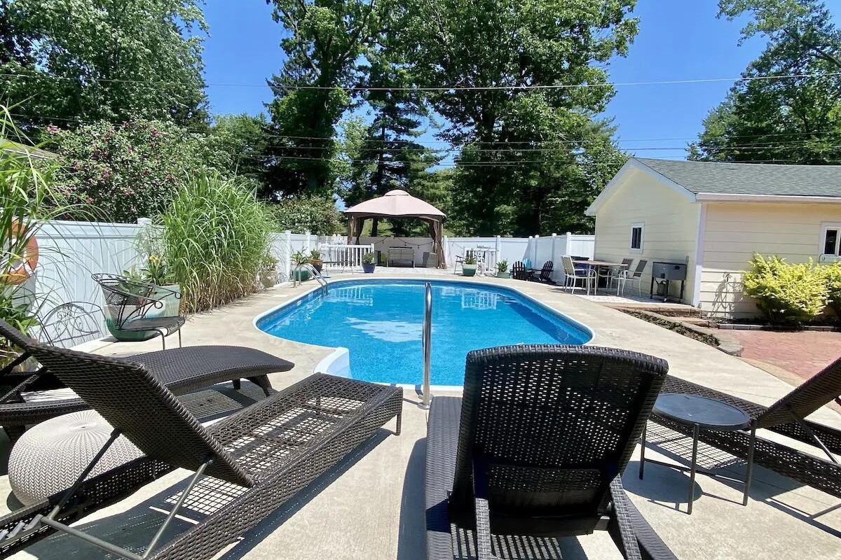 Beautiful 4 BR 2 BA home in the heart of New Buffalo with a private pool and hot tub! This private oasis offers a light-filled living area with a large bay window, a well-appointed kitchen, and a dining area that leads to the sunroom.