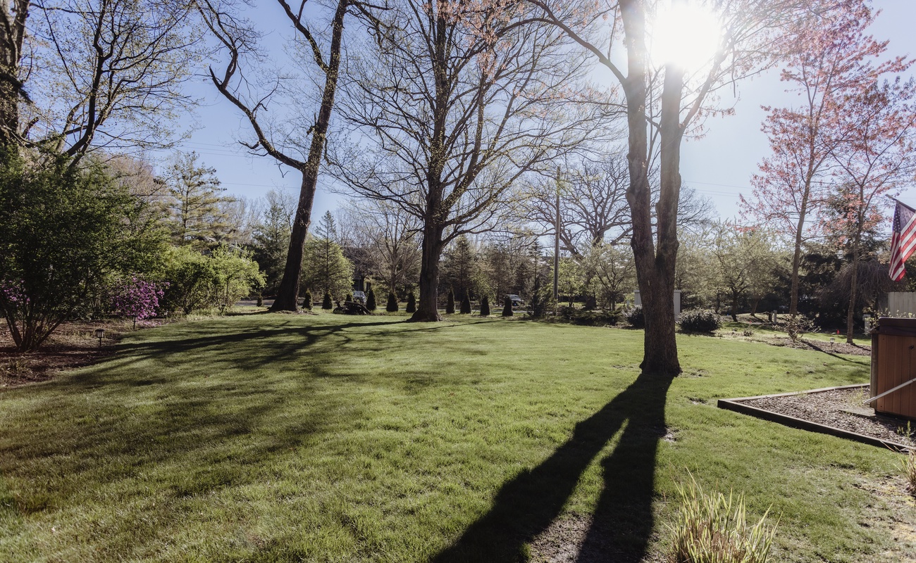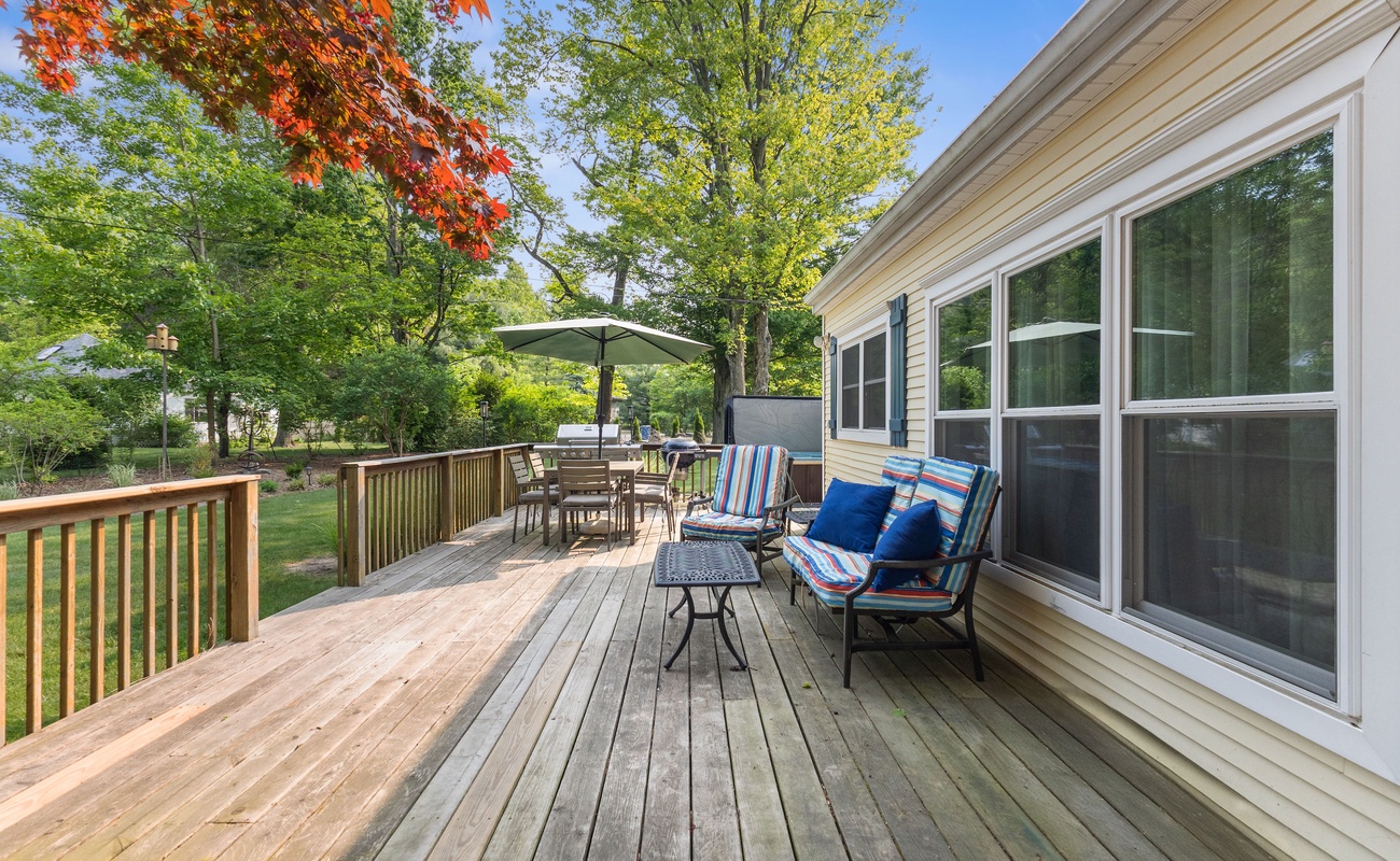 Large grassy yard with a deck for entertaining