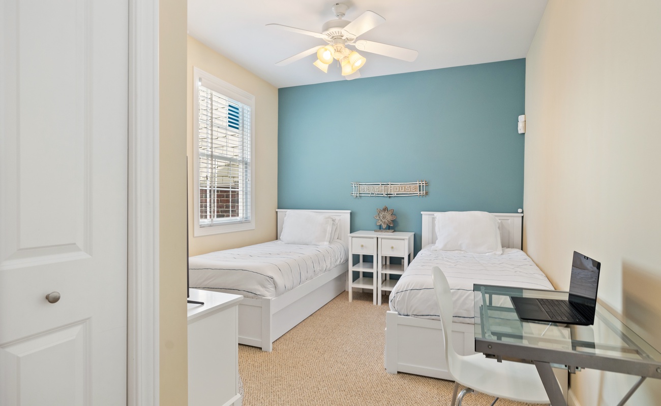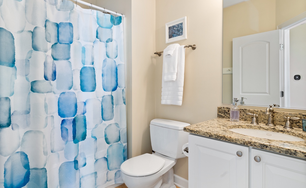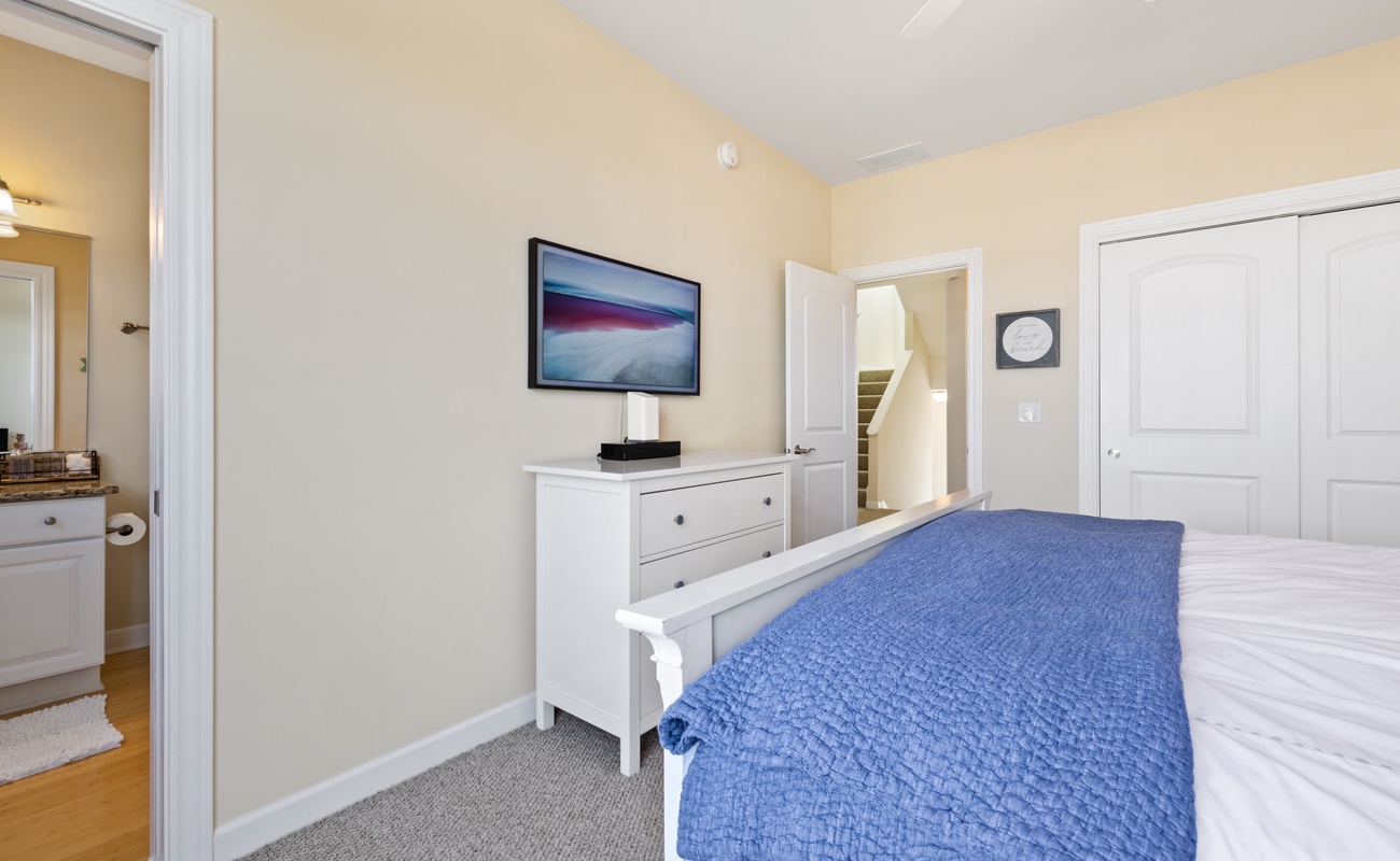 The primary bedroom features a cozy King bed and ensuite full bathroom for a private retreat! A second bedroom features a Queen bed and the lower level can sleep three in two twin beds and a trundle. Each bedroom has smart TVs with Roku and a desk so you can unwind and watch your favorite show or get a little work done (if you must).
