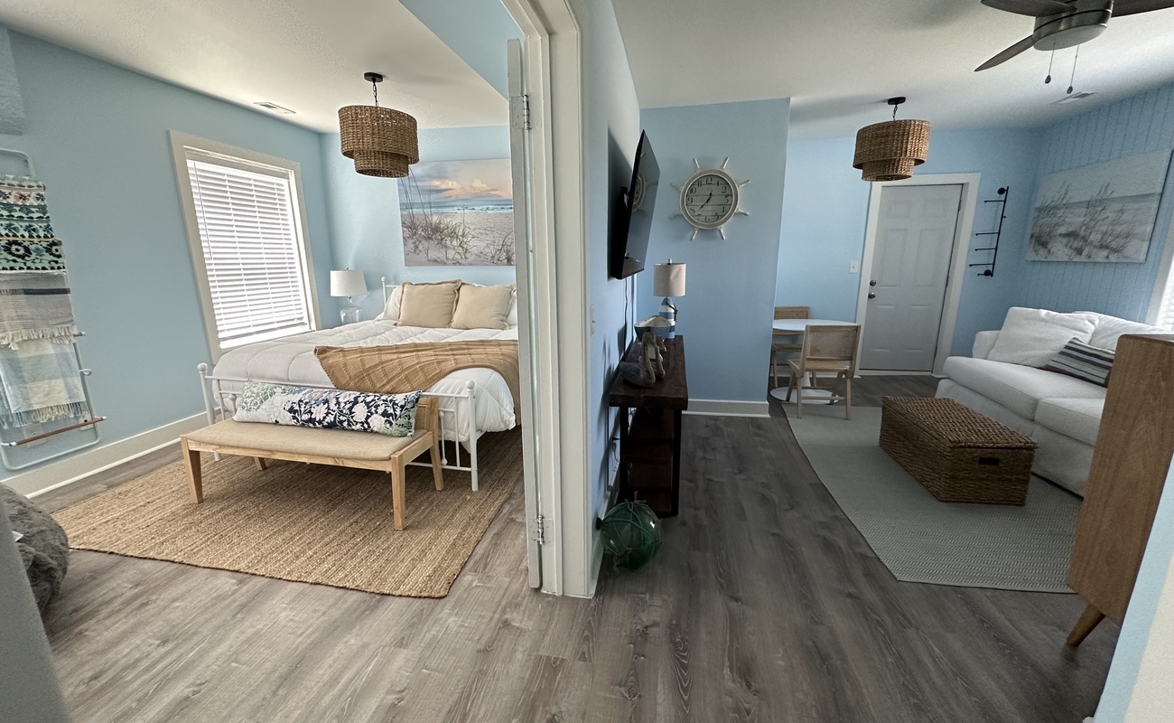 Move through the home through a set of French doors and into a main bedroom with a large King bed and second smart TV. The sofa in the main room pulls out into a full size bed to sleep an extra guest or two.