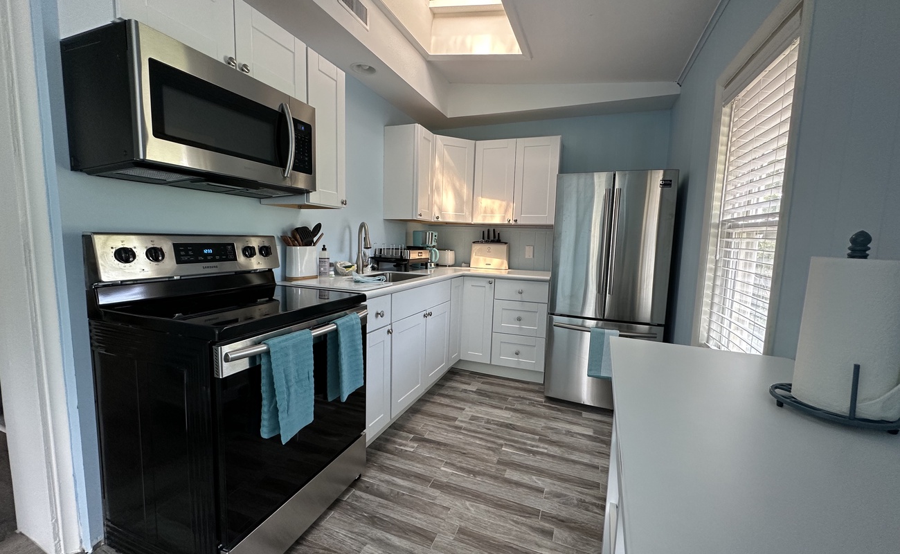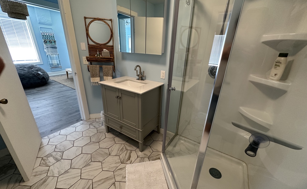 Off the main living area is a full size bathroom with shower and ample bath linens. At the back of the home is a full kitchen with a French door refrigerator. There is also a small dining area in the kitchen, perfect for morning coffee or snacking while you meal prep. There is also a Weber gas grill on the small deck by the entrance that you can use throughout your stay.