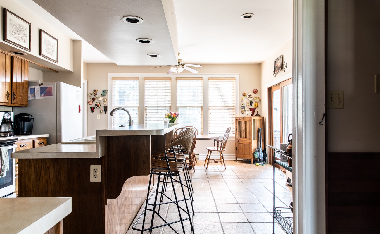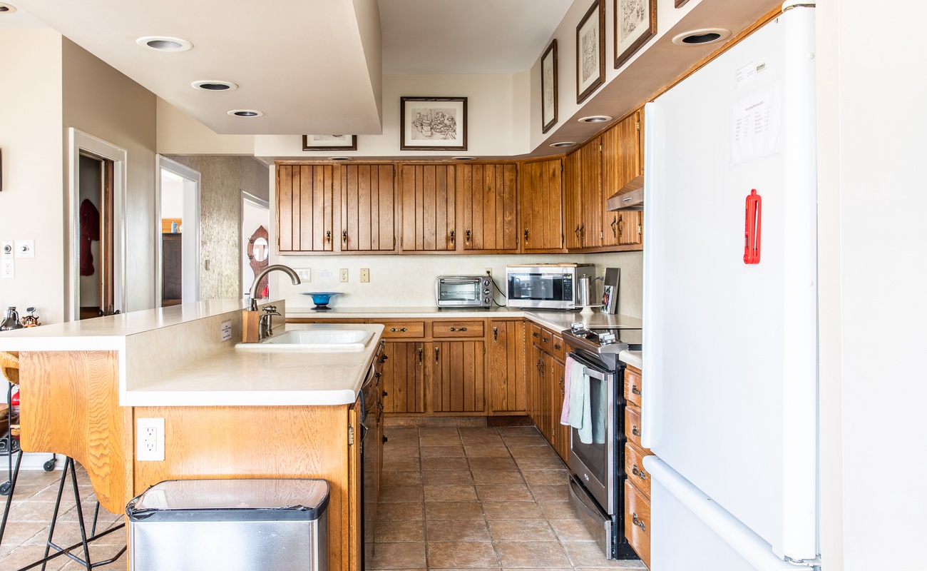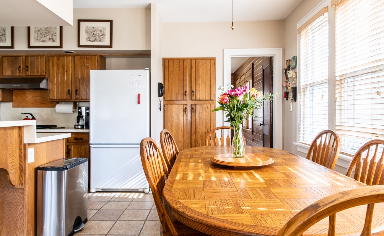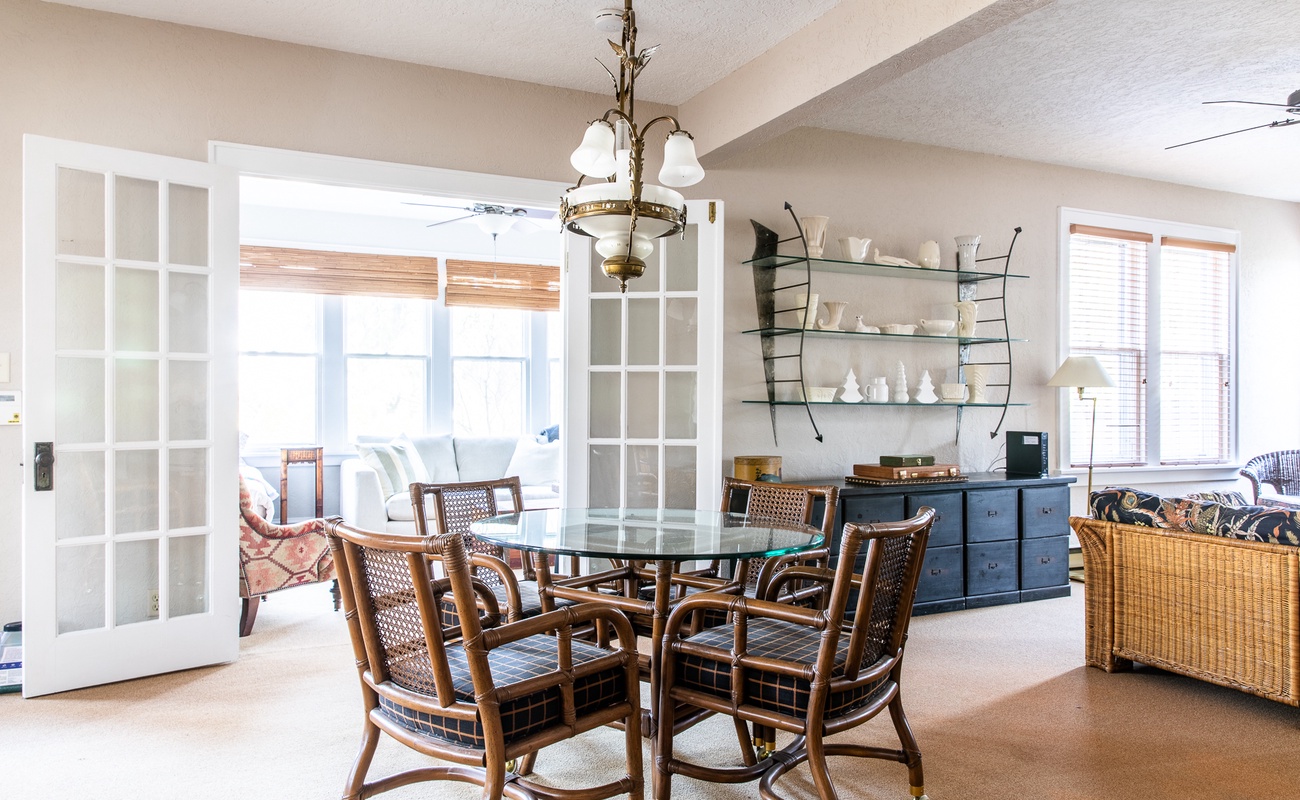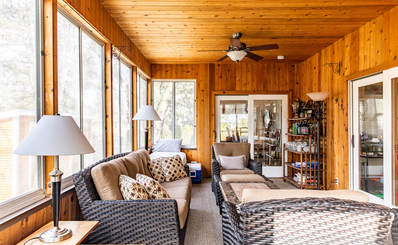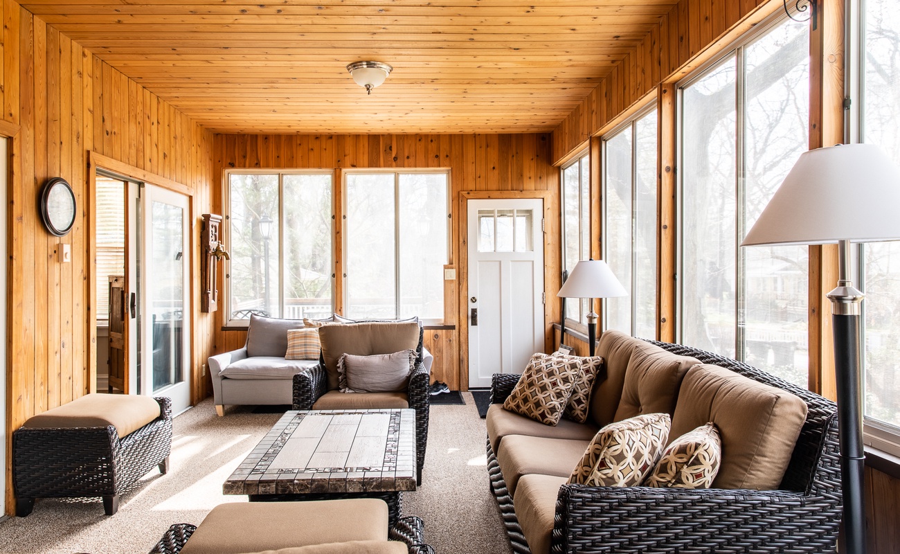 If you continue on through the home you'll find yourself in a large, eat-in kitchen with a dinette table that opens to a spacious and well-furnished three seasons room. Just off the kitchen is a powder room as well as access to a cozy den area with a TV and couch.