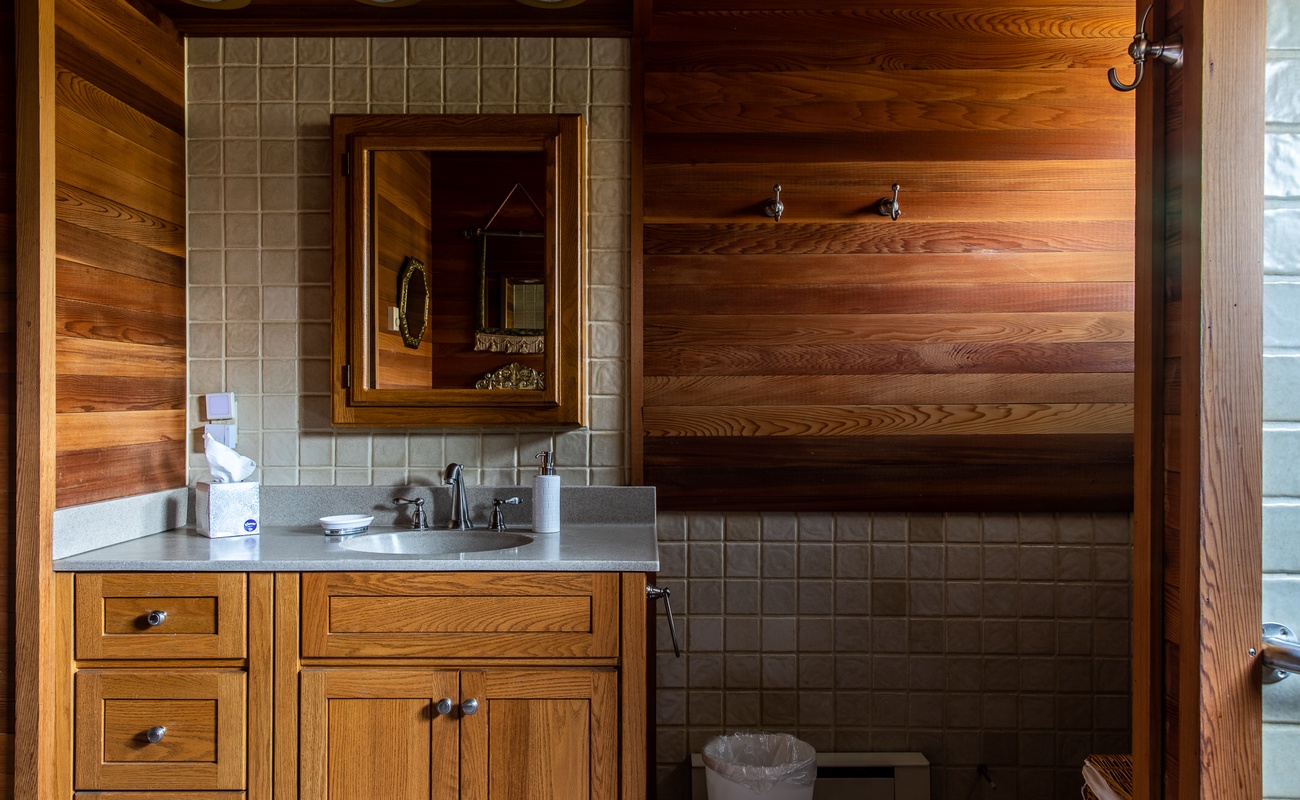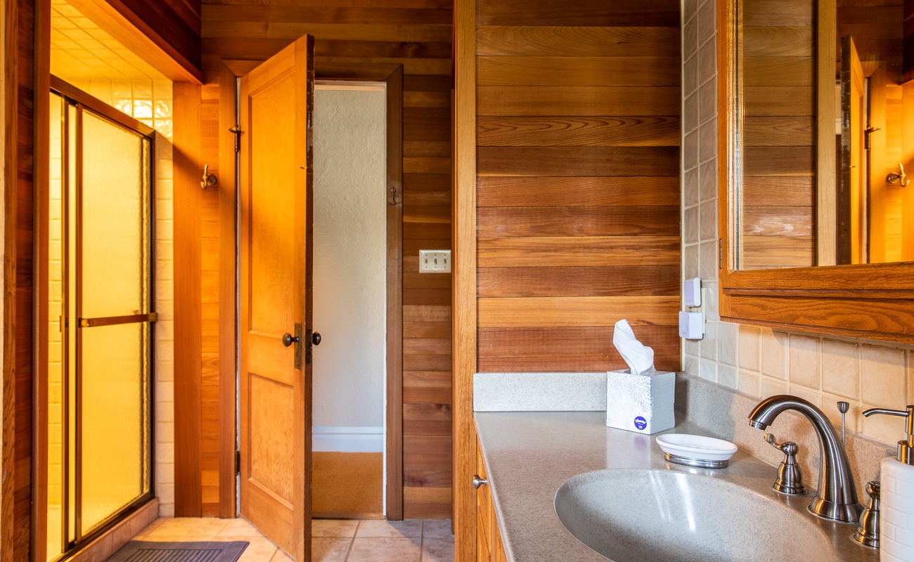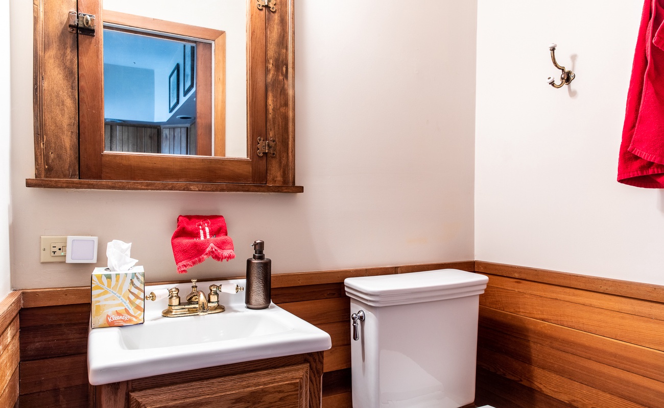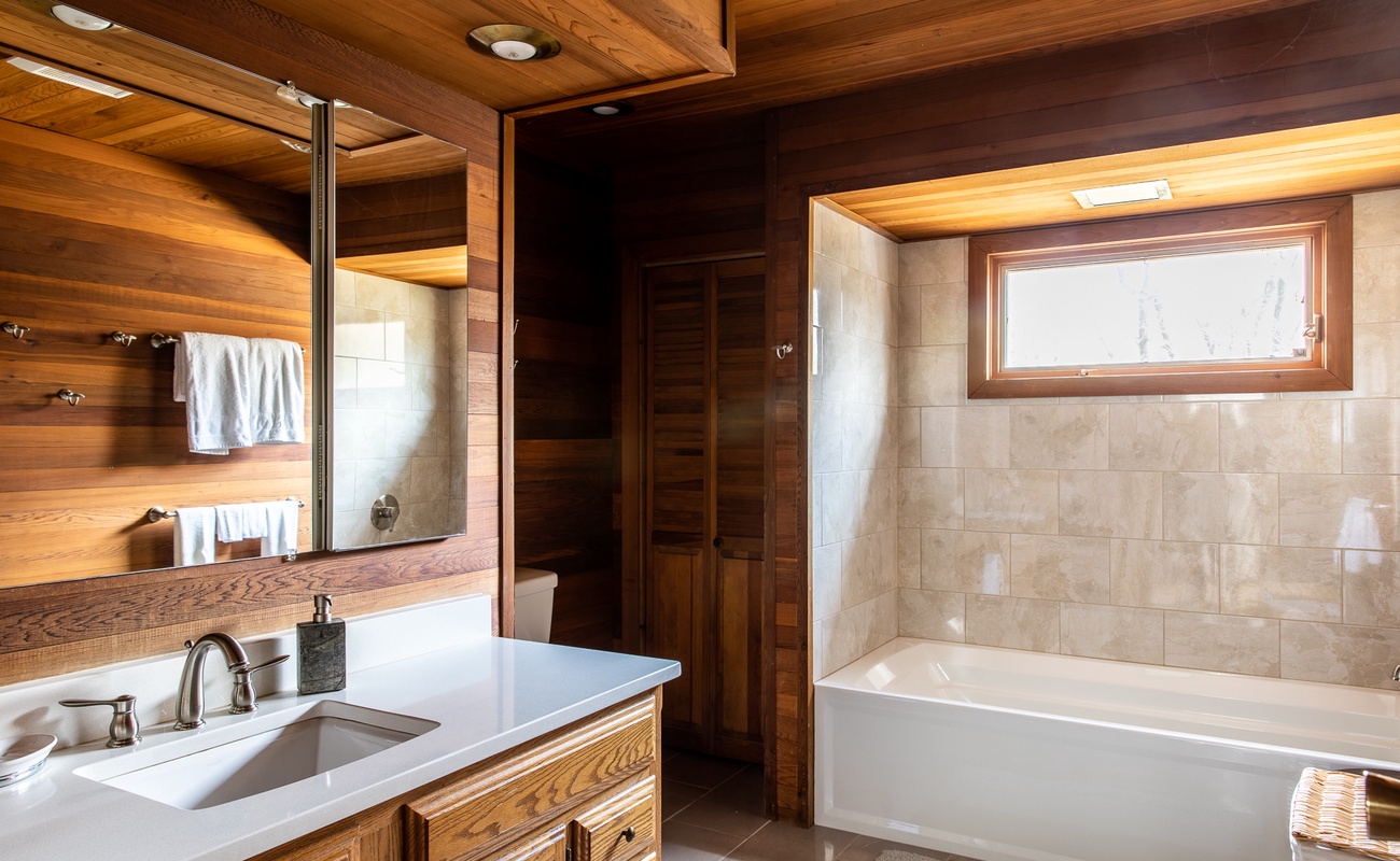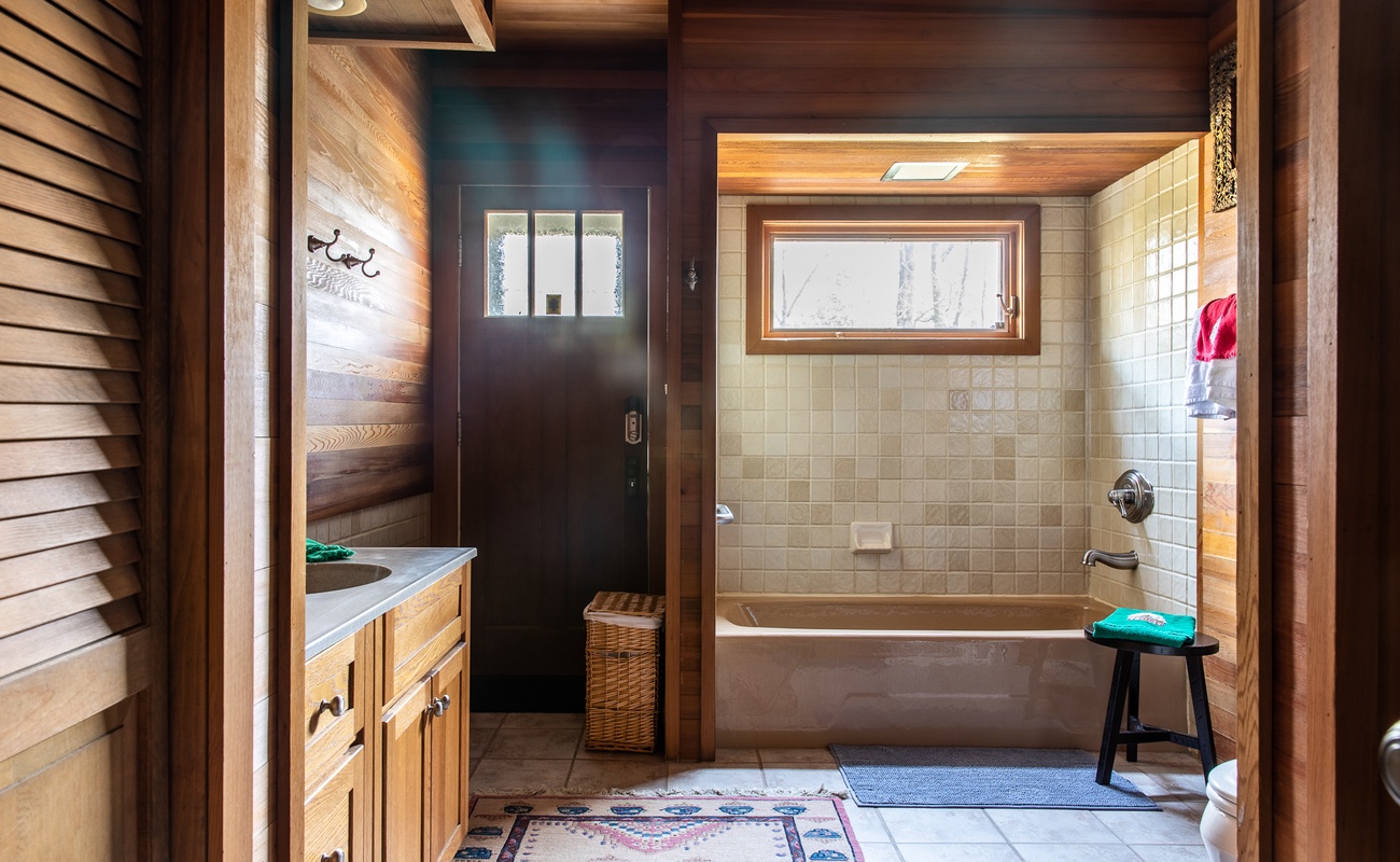 Just down the hall is a large main floor bedroom and bathroom with outdoor access to the hot tub area.