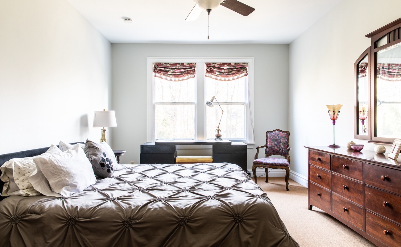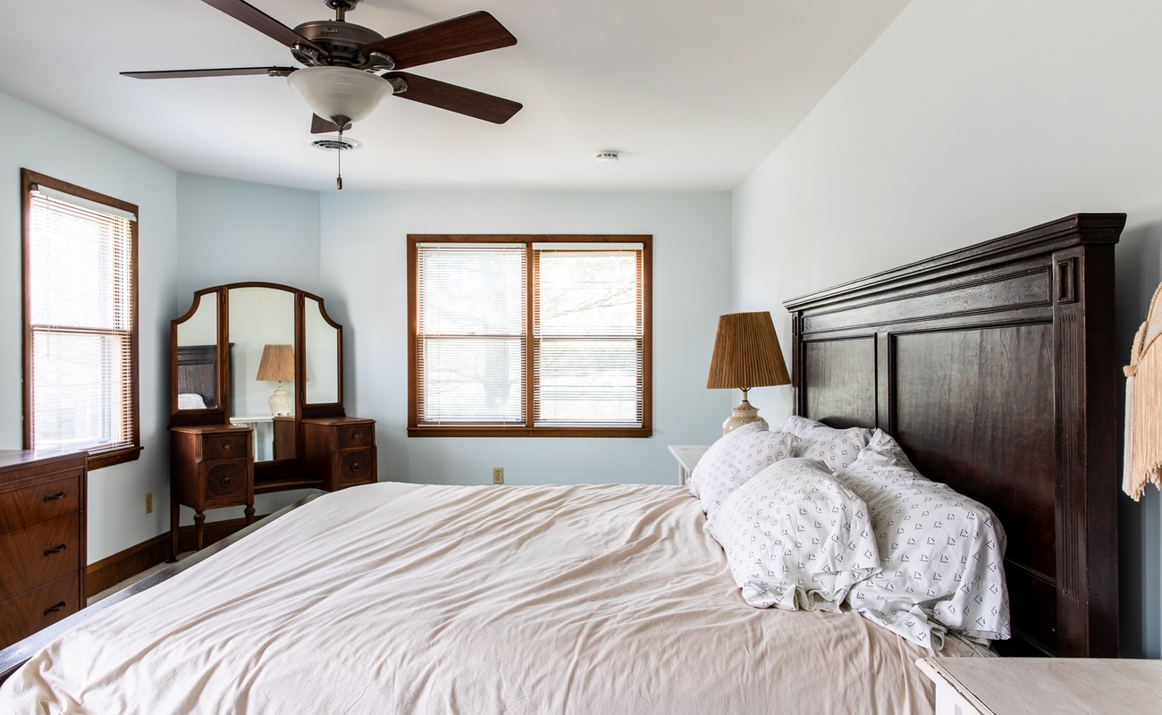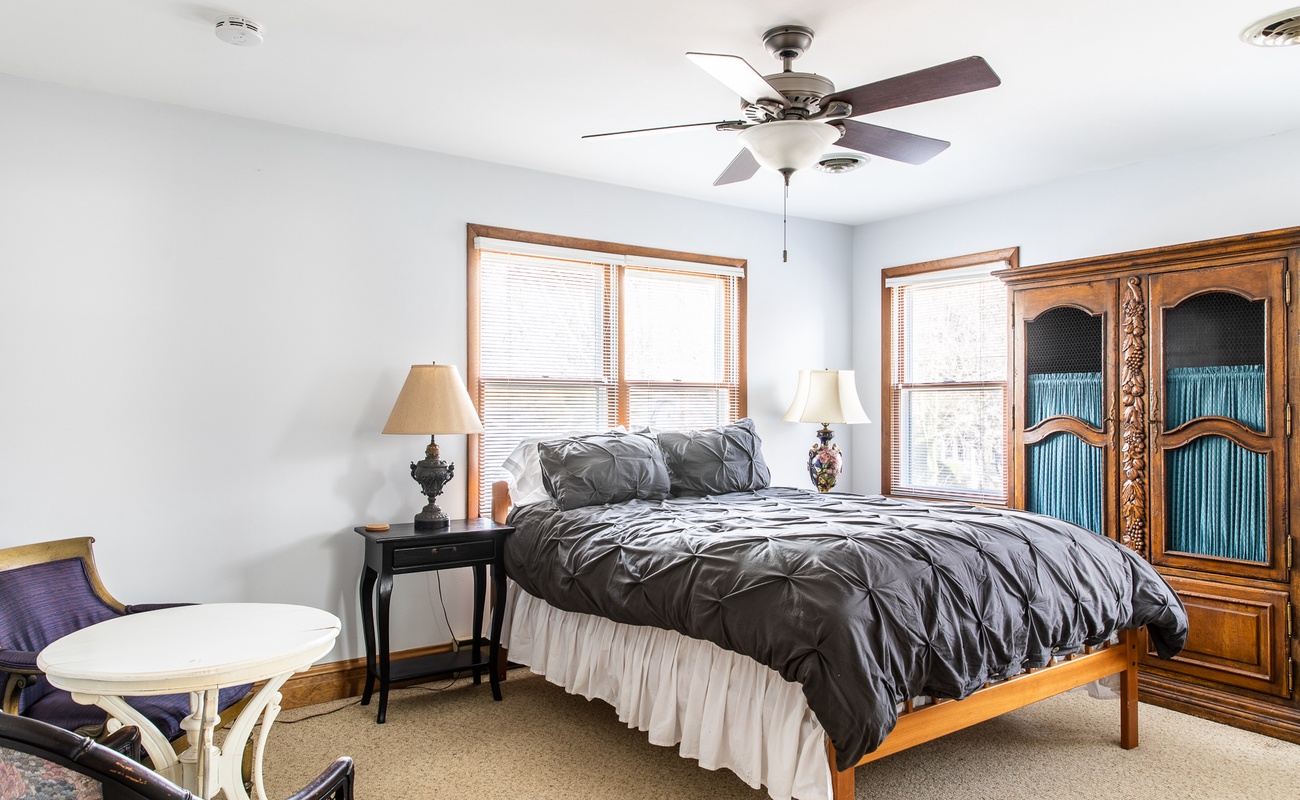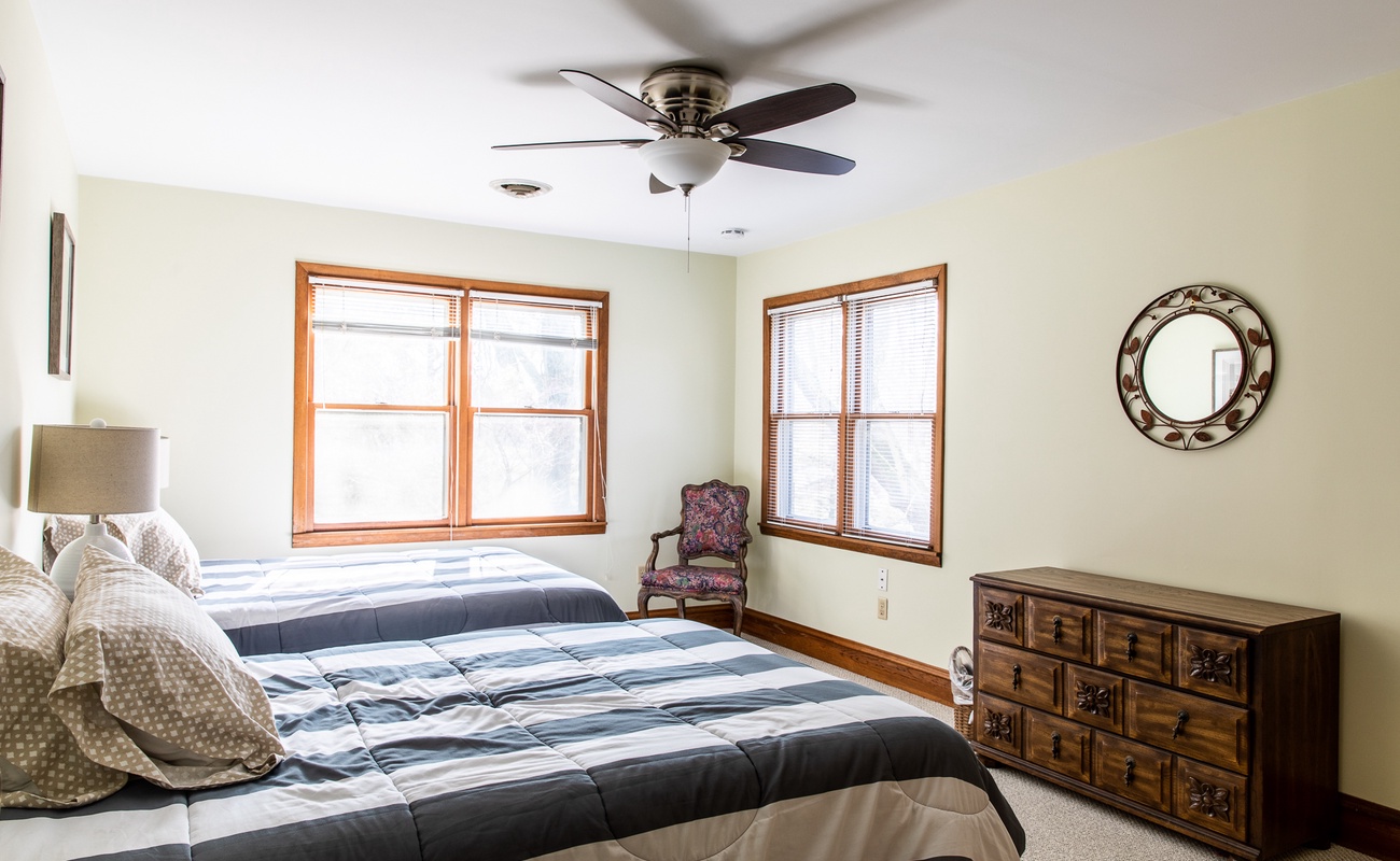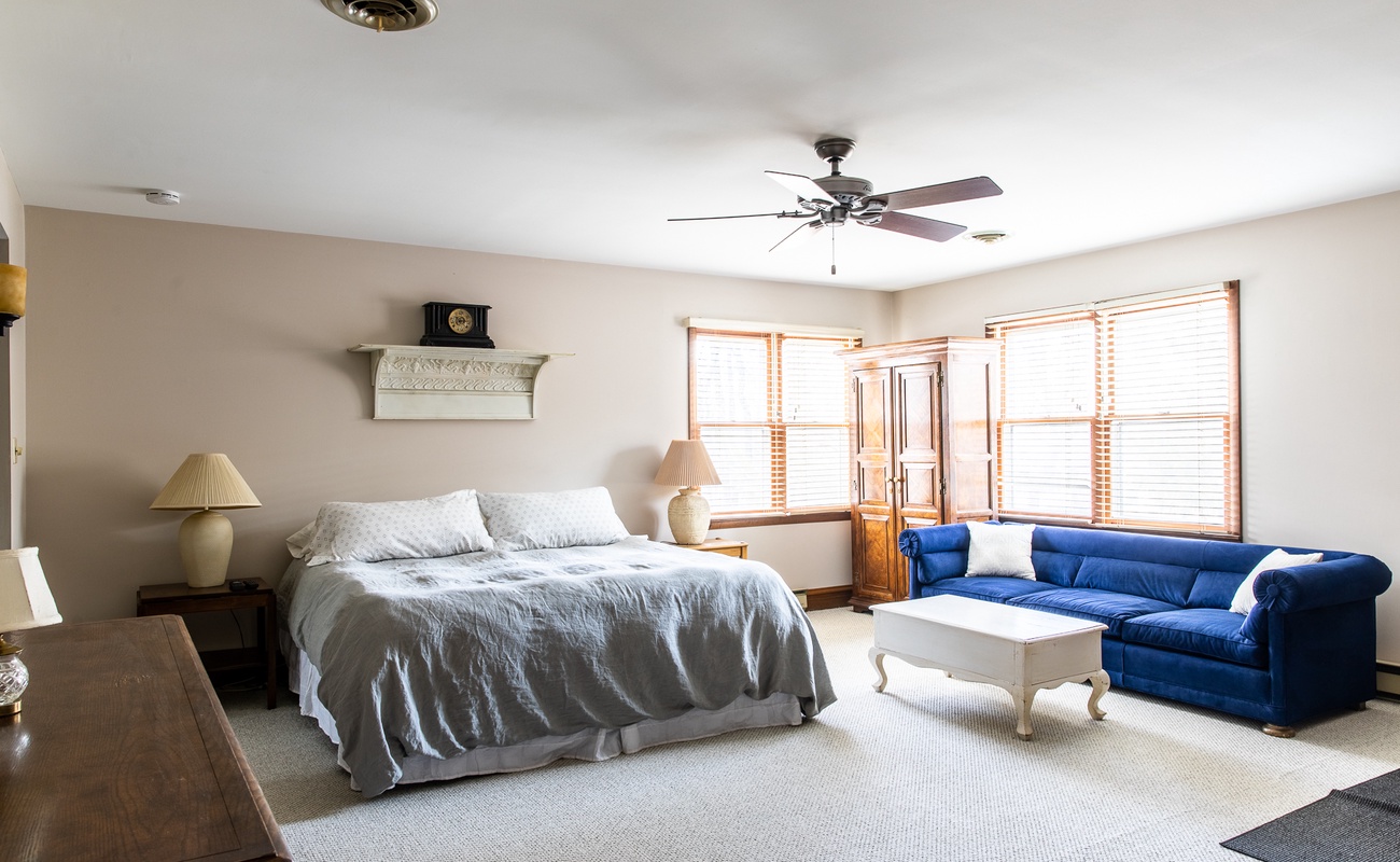 Heading upstairs, the home has 6 bedrooms. The large master suite has a blue velvet sofa and a King bed with a fireplace in the room. The next bedroom features a King-sized bed with lots of natural light. Down the hall are three more spacious bedrooms, one with a Queen bed and two bedrooms with two twin beds each.