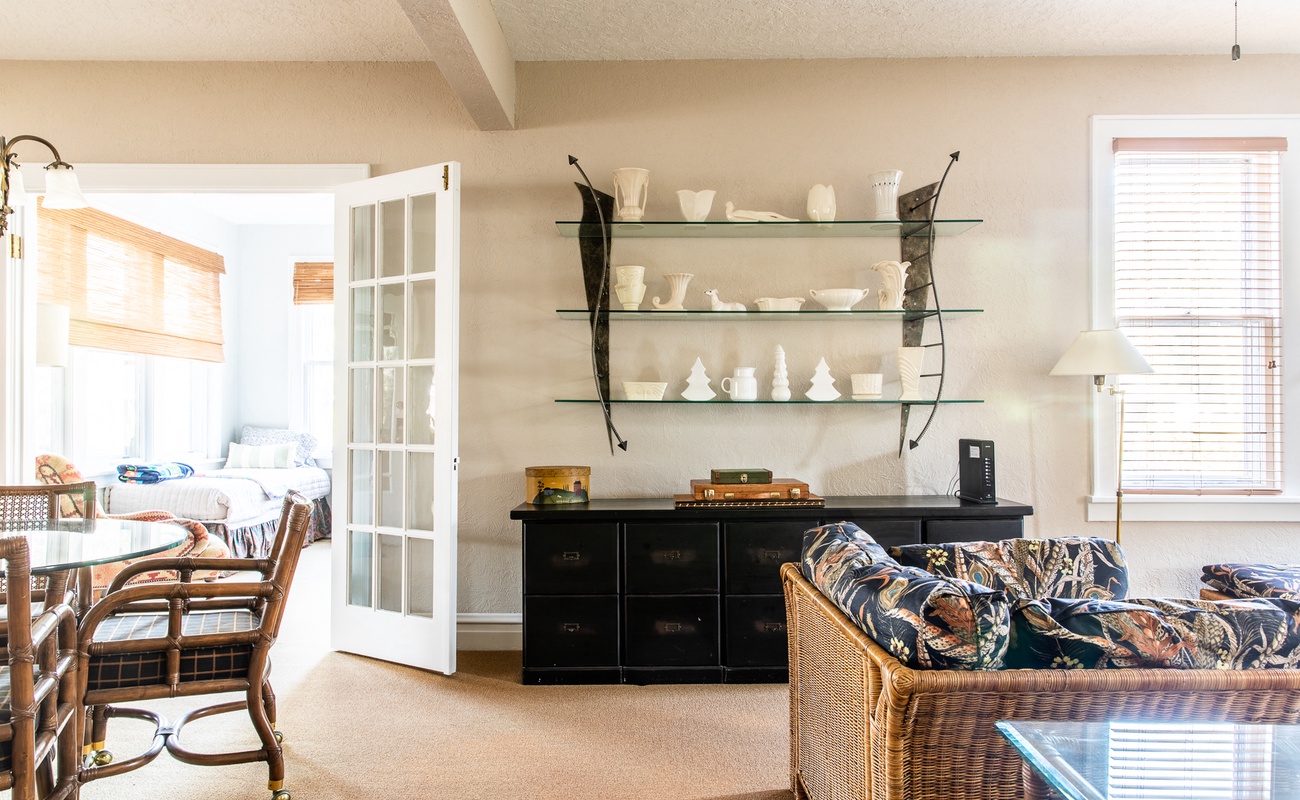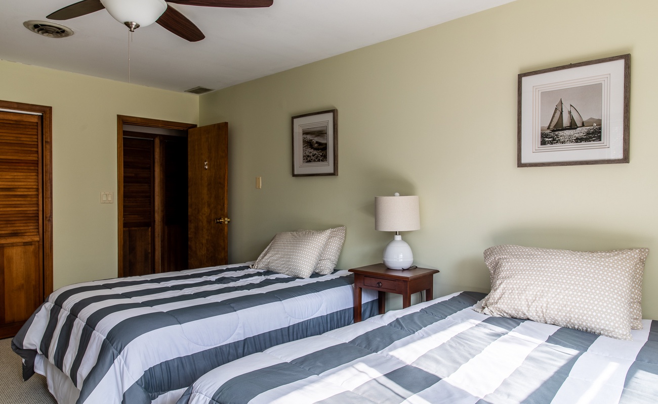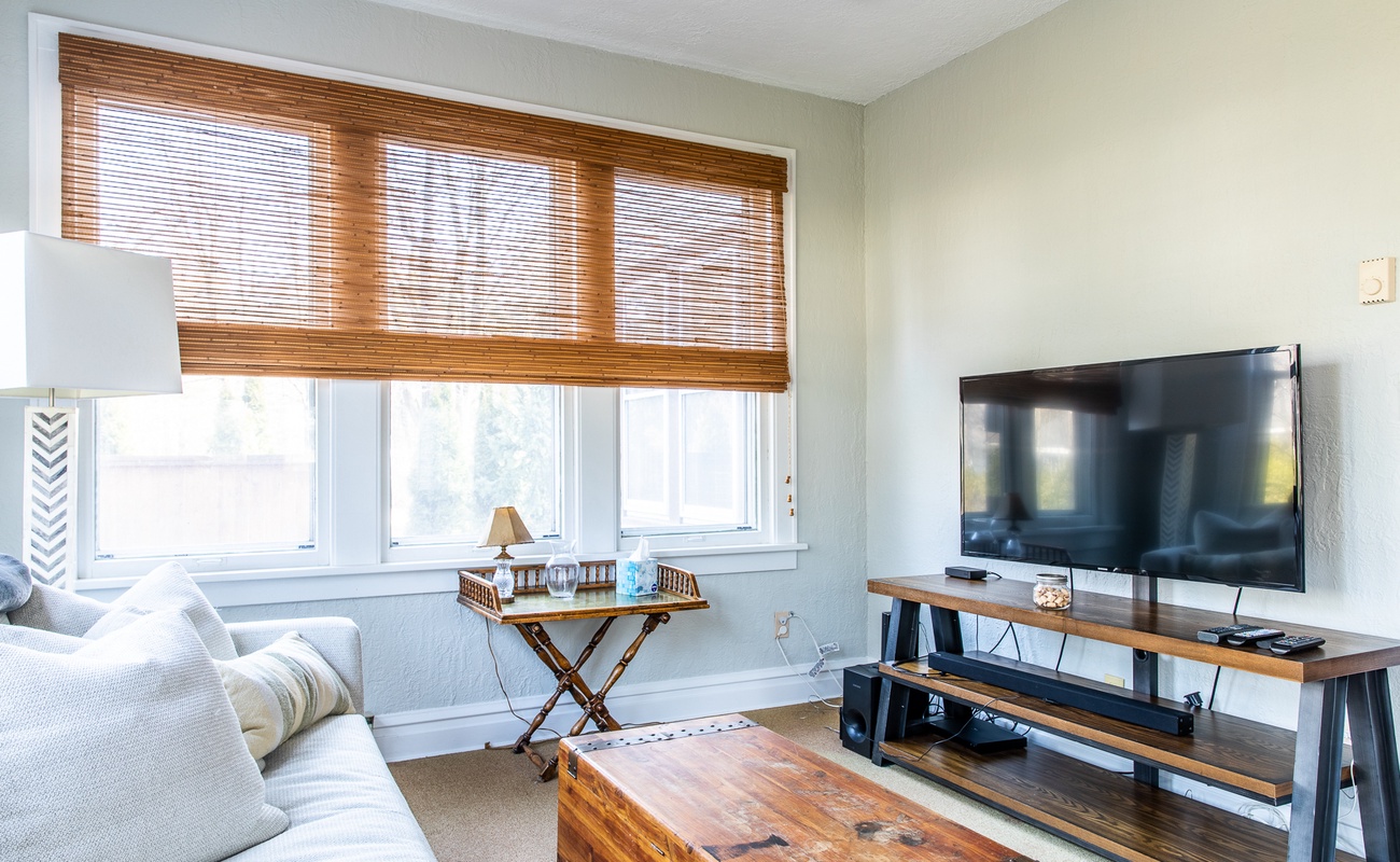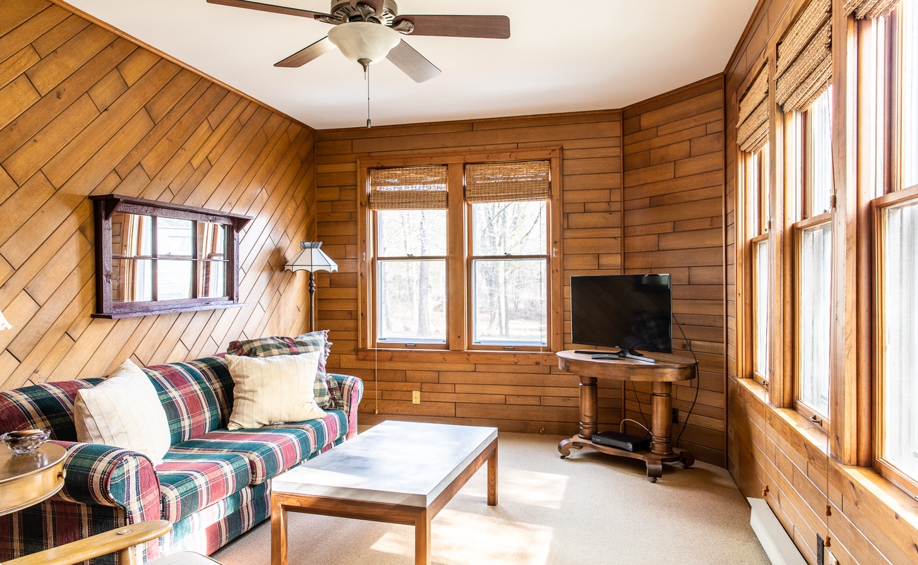 There is also a cozy sunroom with a TV, twin bed, and sofa off the main living space as well.