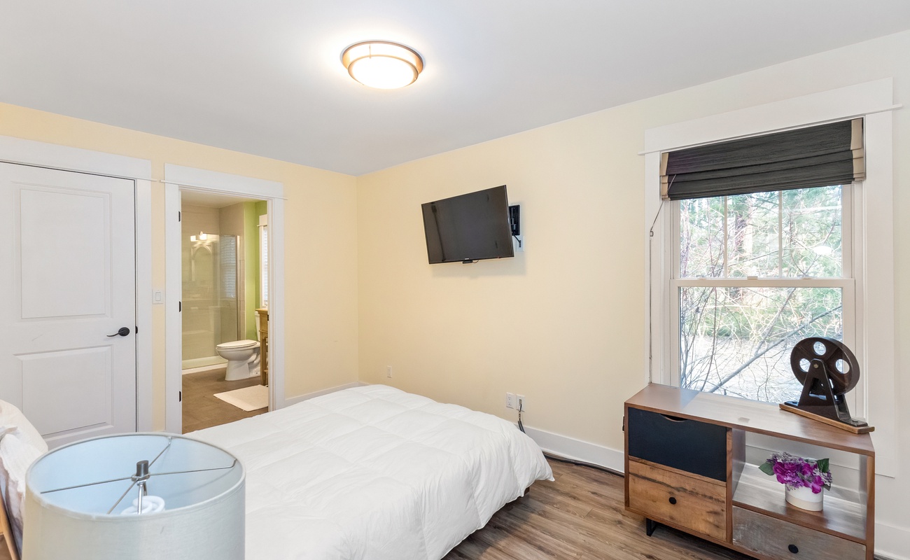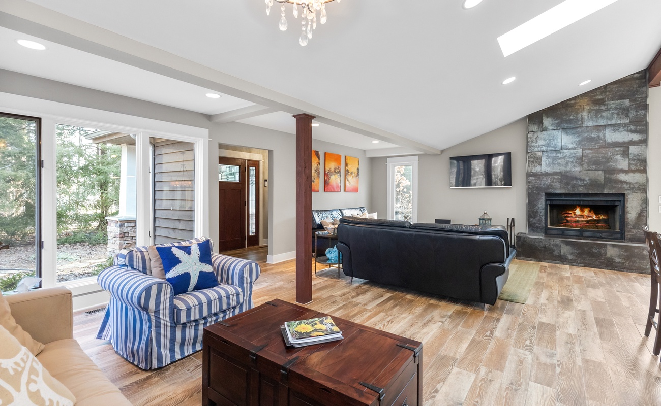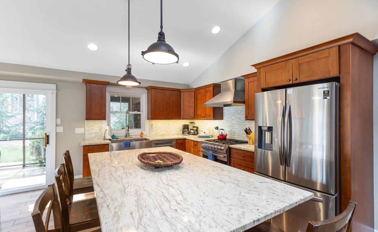 Step inside to a bright and open living space, where the fully-equipped kitchen with a large island flows seamlessly into the cozy living and dining areas. Whether you're prepping a lakeside picnic or enjoying a slow breakfast before a day of adventure, the kitchen is the heart of this home.