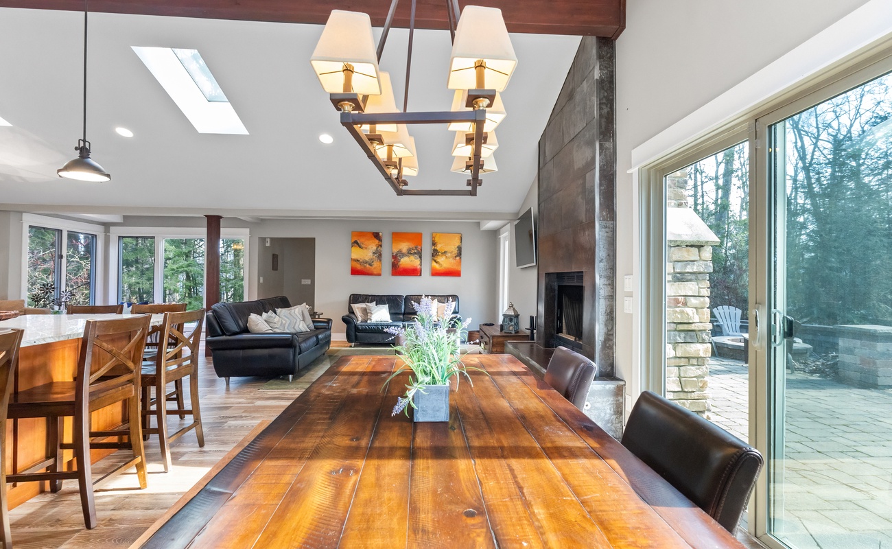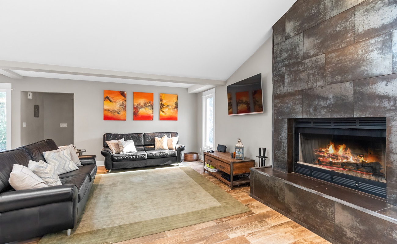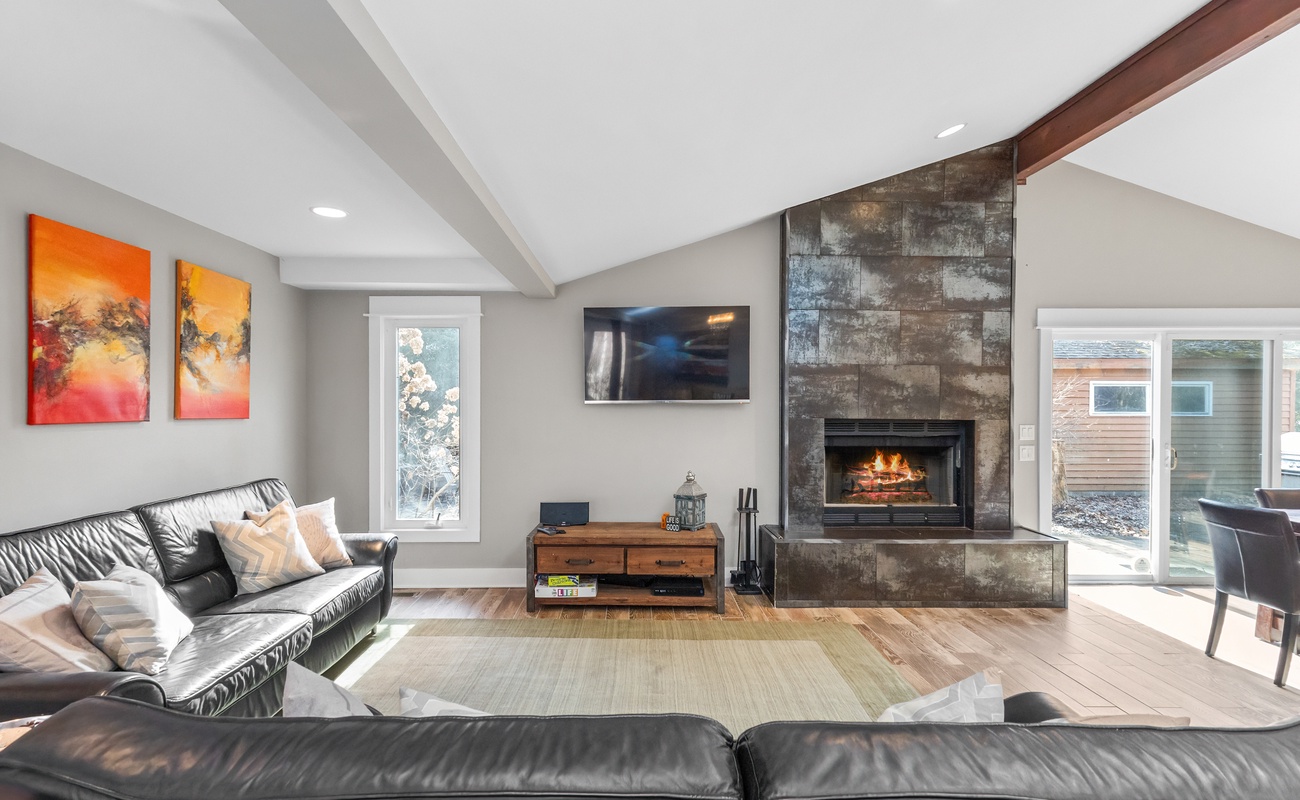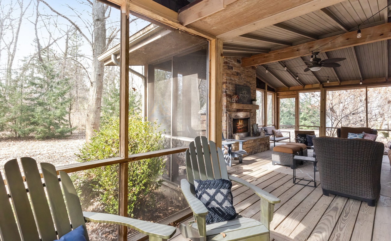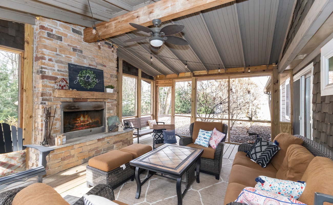 Outside, you'll find plenty of space to enjoy the natural beauty surrounding Sunset Breeze. Gather around the outdoor fire pit for s'mores and stories under the stars, or unwind in the screened-in porch with its stunning wood-burning fireplace — a cozy spot for morning coffee or evening wine.